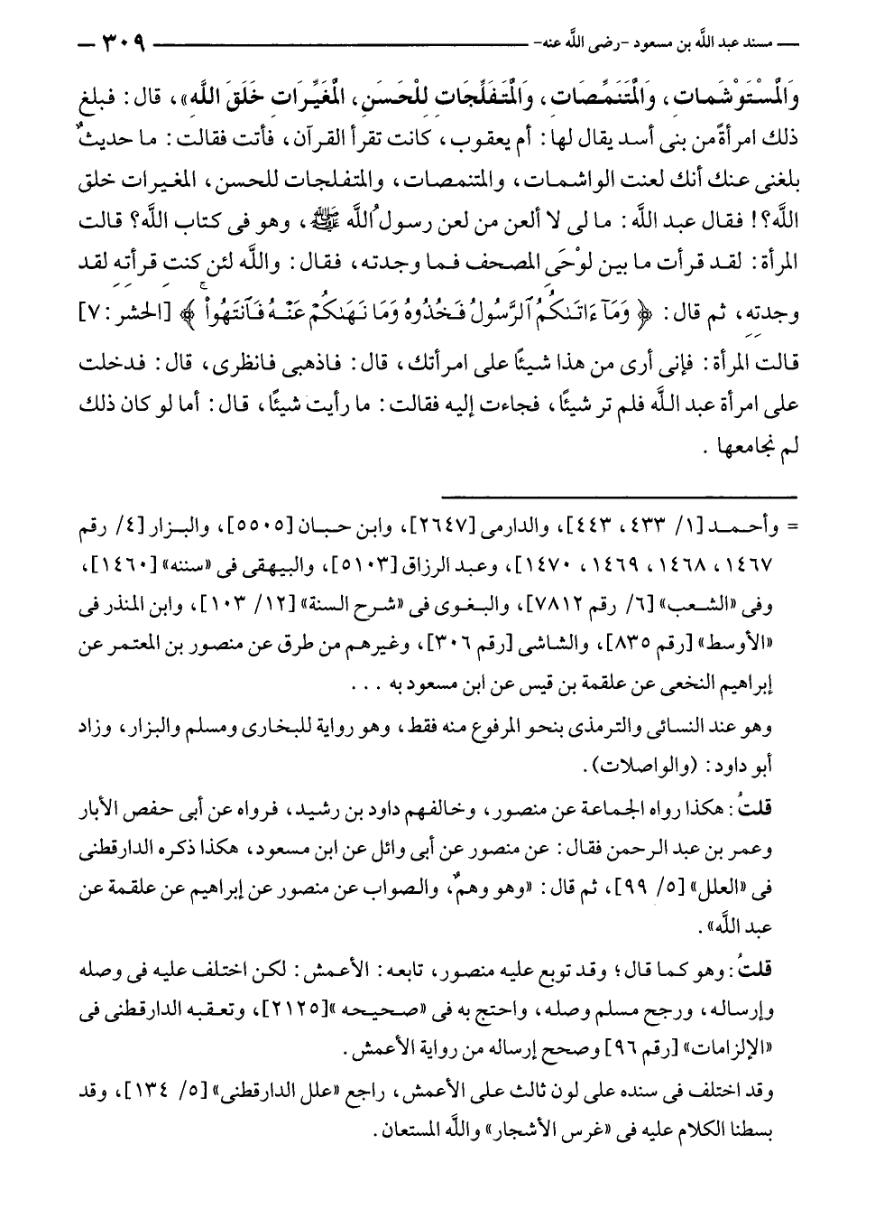 وَالْمسْتَوْشَماتِ، وَالْمتَنَمِّصَات، وَالْمتَفَلِّجَاتِ لِلْحَسَنِ، المُغَيِّرَاتِ خَلَقَ الله"، قال: فبلغ ذلك امرأةً من بنى أسد يقال لها: أم يعقوب، كانت تقرأ القران، فأتت فقالت: ما حديثٌ بلغنى عنك أنك لعنت الواشمات، والمتنمصات، والمتفلجات للحسن، المغيرات خلق الله؟! فقال عبد الله: ما لى لا ألعن من لعن رسولُ الله - صلى الله عليه وسلم -، وهو في كتاب الله؟ قالت المرأة: لقد قرأت ما بين لوْحَى المصحف فما وجدته، فقال: واللَّه لئن كنتِ قرأته لقد وجدتِهِ، ثم قال: {وَمَآءَاتَنكُمُ آلرَّسُولُ فَخُذُوهُ وَمَا نَهَنكُتم عَنهُ فَآنتَهُوأ} [الحشر: ٧] قالت المرأة: فإنى أرى من هذا شيئًا على امرأتك، قال: فاذهبى فانظرى، قال: فدخلت على امرأة عبد الله فلم تر شيئًا، فجاءت إليه فقالت: ما رأيت شيئًا، قال: أما لو كان ذلك لم نجامعها.