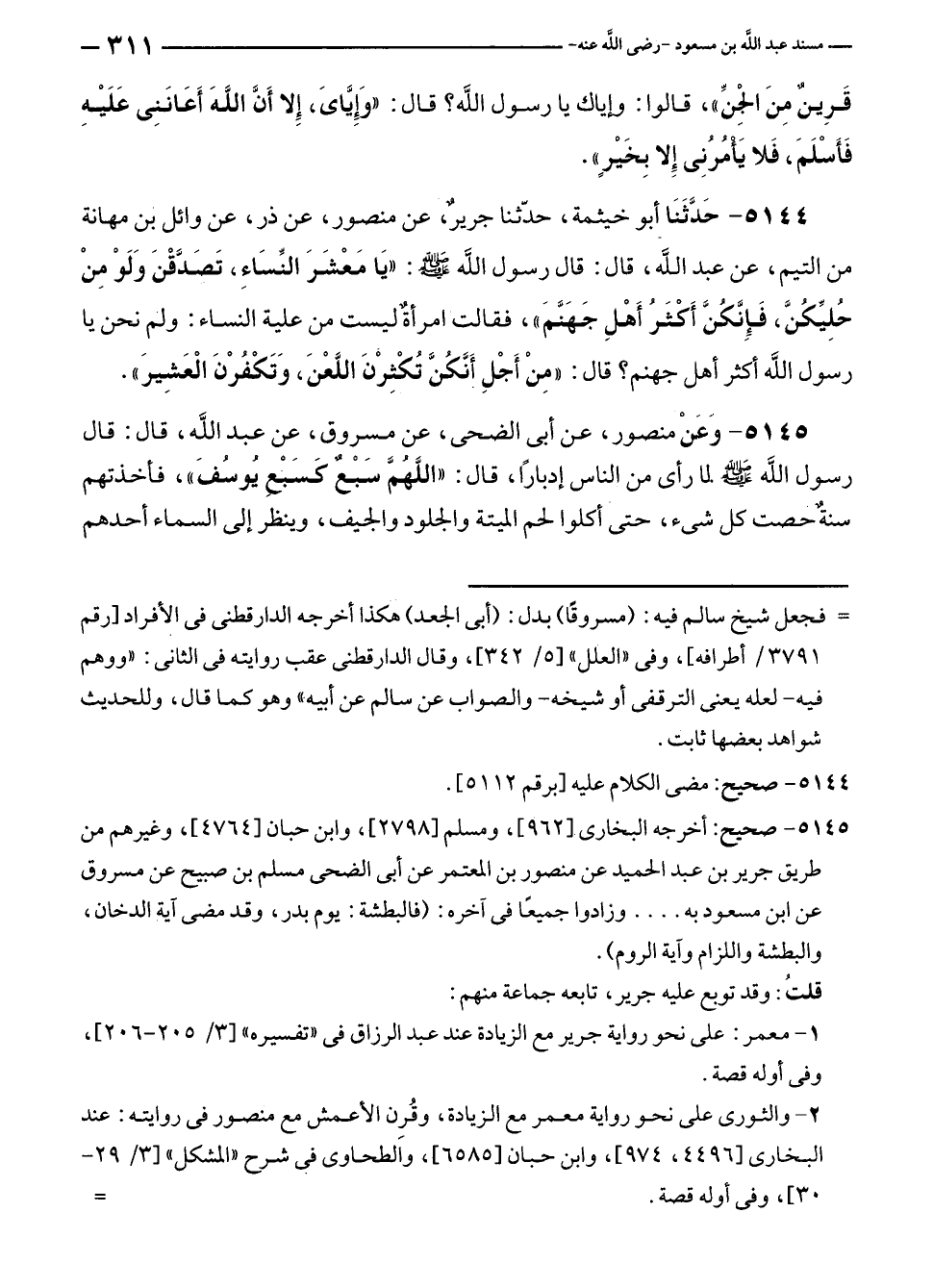 ٥١٤٥ - وَعَنْ منصور، عن أبي الضحى، عن مسروق، عن عبد الله، قال: قال رسول الله - صلى الله عليه وسلم - لما رأى من الناس إدبارًا، قال: "اللَّهمَّ سَبْعٌ كسَبْعِ يُوسُفَ"، فاخذتهم سنةٌ حصت كل شيء، حتى أكلوا لحم الميتة والجلود والجيف، وينظر إلى السماء أحدهم