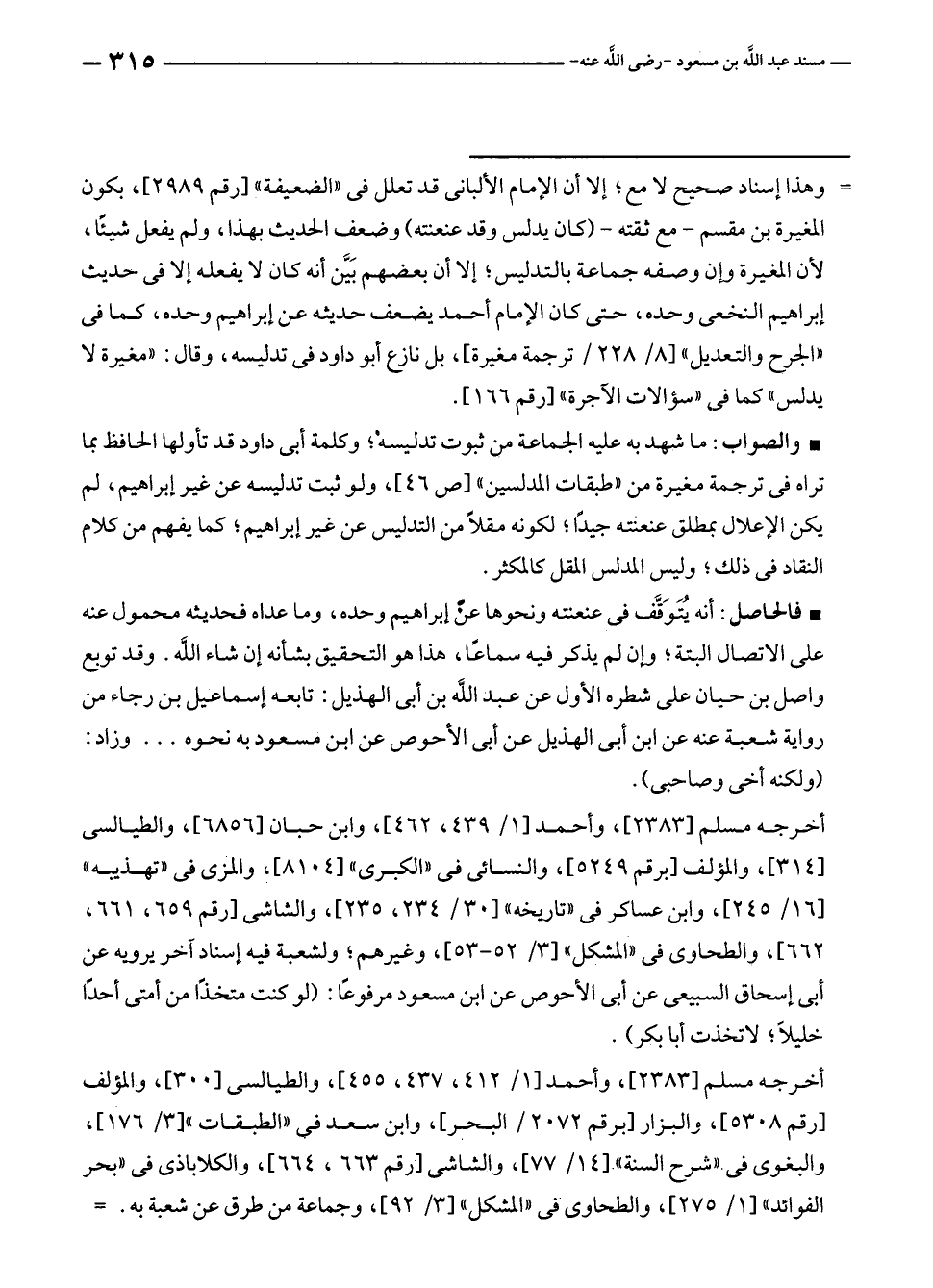 • والصواب: ما شهد به عليه الجماعة من ثبوت تدليسه؛ وكلمة أبي داود قد تأولها الحافظ بما تراه في ترجمة مغيرة من "طبقات المدلسين" [ص ٤٦]، ولو ثبت تدليسه عن غير إبراهيم، لم يكن الإعلال بمطلق عنعنته جيدًا؛ لكونه مقلًا من التدليس عن غير إبراهيم؛ كما يفهم من كلام النقاد في ذلك؛ وليس المدلس المقل كالمكثر.