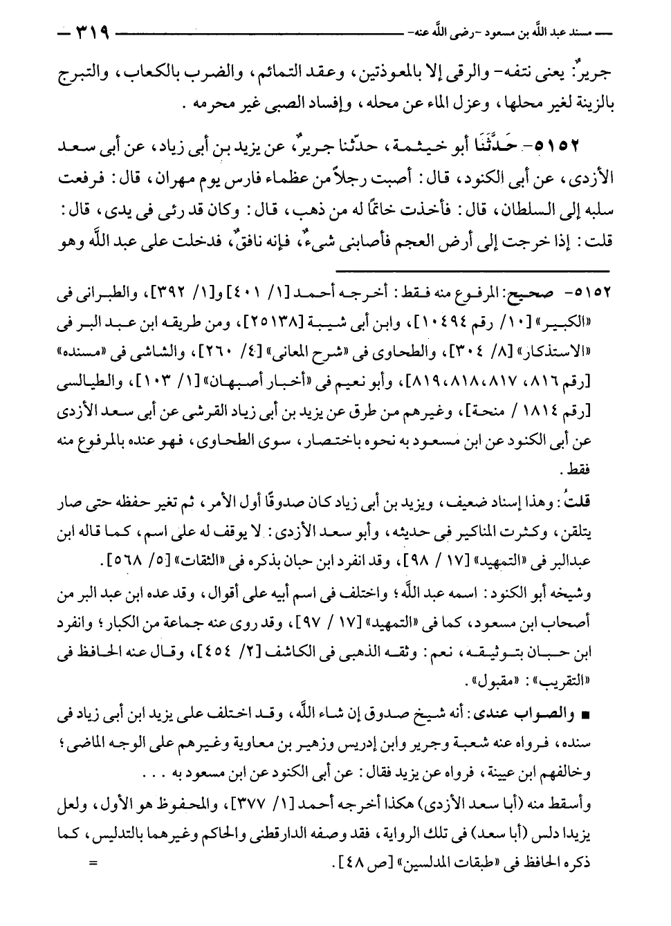 ٥١٥٢ - صحيح: المرفوع منه فقط: أخرجه أحمد [١/ ٤٠١] و [١/ ٣٩٢]، والطبراني في "الكبير" [١٠/ رقم ١٠٤٩٤]، وابن أبي شيبة [٢٥١٣٨]، ومن طريقه ابن عبد البر في "الاستذكار" [٨/ ٣٠٤]، والطحاوى في "شرح المعاني" [٤/ ٢٦٠]، والشاشى في "مسنده" [رقم ٨١٦، ٨١٧، ٨١٨، ٨١٩]، وأبو نعيم في "أخبار أصبهان" [١/ ١٠٣]، والطيالسى [رقم ١٨١٤/ منحة]، وغيرهم من طرق عن يزيد بن أبي زياد القرشى عن أبي سعد الأزدى عن أبي الكنود عن ابن مسعود به نحوه باختصار، سوى الطحاوى، فهو عنده بالمرفوع منه فقط.