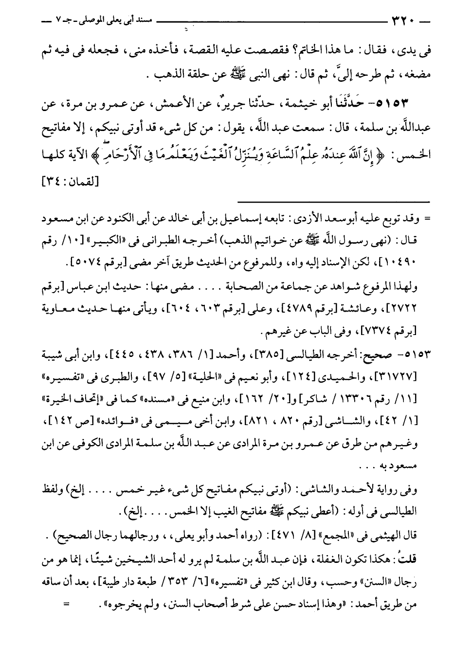 ٥١٥٣ - حَدَّثَنَا أبو خيثمة، حدّثنا جريرٌ، عن الأعمش، عن عمرو بن مرة، عن عبد الله بن سلمة، قال: سمعت عبد الله، يقول: من كل شيء قد أوتى نبيكم، إلا مفاتيح الخمس: {إِنَّ اللَّهَ عِنْدَهُ عِلْمُ السَّاعَةِ وَيُنَزِّلُ الْغَيْثَ وَيَعْلَمُ مَا فِي الْأَرْحَامِ} الآية كلها [لقمان: ٣٤].