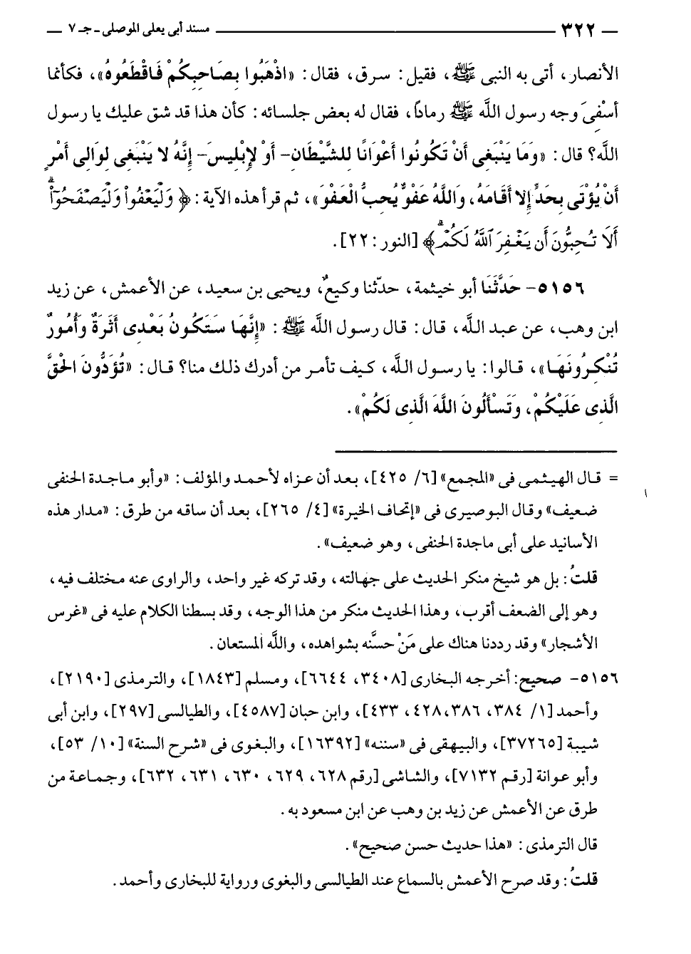 ٥١٥٦ - حَدَّثَنَا أبو خيثمة، حدّثنا وكيعٌ، ويحيى بن سعيد، عن الأعمش، عن زيدٍ بن وهب، عن عبد الله، قال: قال رسول الله - صلى الله عليه وسلم -: "إِنَّهَا سَتَكون بَعْدِى أَثَرَةٌ وَأُمُورٌ تُنْكِرُونَهَا"، قالوا: يا رسول الله، كيف تأمر من أدرك ذلك منا؟ قال: "تُؤَدُّونَ الحقَّ الَّذِي عَلَيْكُمْ، وَتَسْالُونَ اللَّهَ الَّذِي لَكُمْ".