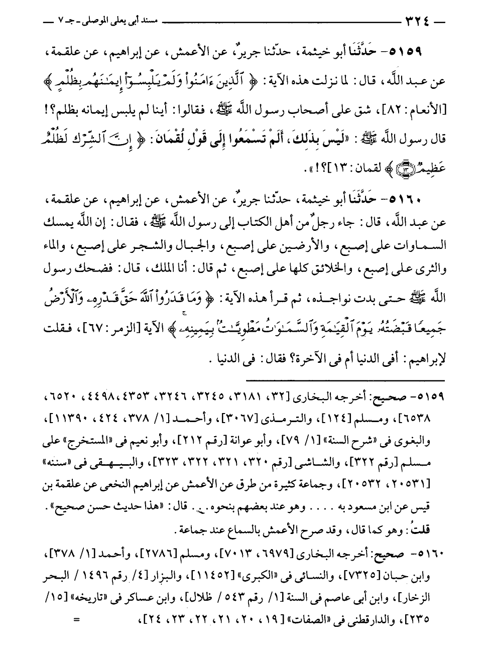 ٥١٥٩ - حَدَّثَنَا أبو خيثمة، حدّثنا جريرٌ، عن الأعمش، عن إبراهيم، عن علقمة، عن عبد الله، قال: لما نزلت هذه الآية: {الَّذِينَ آمَنُوا وَلَمْ يَلْبِسُوا إِيمَانَهُمْ} [الأنعام: ٨٢]، شق على أصحاب رسول الله - صلى الله عليه وسلم -، فقالوا: أينا لم يلبس إيمانه بظلم؟! قال رسول الله - صلى الله عليه وسلم -: "لَيْسَ بِذَلِكَ، أَلَمْ تَسْمَعُوا إِلَى قَوْلِ لُقْمَانَ: {إِنَّ الشِّرْكَ لَظُلْمٌ عَظِيمٌ (١٣} لقمان:١٣]؟! ".