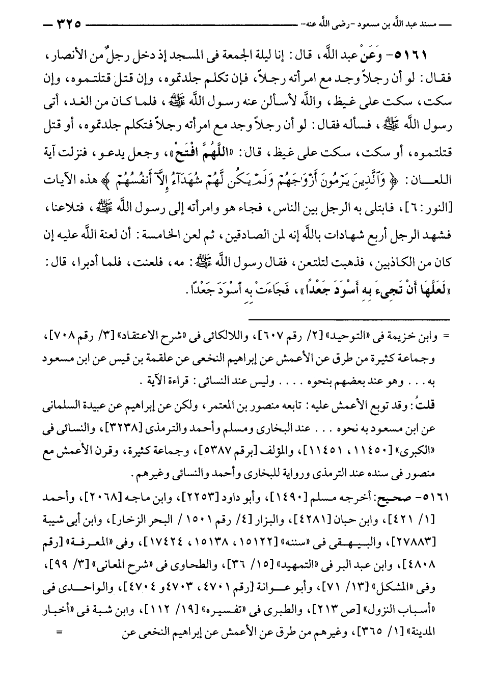 ٥١٦١ - وَعَنْ عبد الله، قال: إنا ليلة الجمعة في المسجد إذ دخل رجل من الأنصار، فقال: لو أن رجلًا وجد مع امرأته رجلًا، فإن تكلم جلدتموه، وإن قتل قتلتموه، وإن سكت، سكت على غيظ، واللَّه لأسألن عنه رسول الله - صلى الله عليه وسلم -، فلما كان من الغد، أتى رسول الله - صلى الله عليه وسلم -، فسأله فقال: لو أن رجلًا وجد مع امرأته رجلًا فتكلم جلدتموه، أو قتل قتلتموه، أو سكت، سكت على غيظ، قال: "اللَّهمَّ افْتَحْ"، وجعل يدعو، فنزلت آية اللعان: {وَالَّذِينَ يَرْمُونَ أَزْوَاجَهُمْ وَلَمْ يَكُنْ لَهُمْ شُهَدَاءُ إِلَّا أَنْفُسُهُمْ} هذه الآيات [لنور: ٦]، فابتلى به الرجل بين الناس، فجاء هو وامرأته إلى رسول الله - صلى الله عليه وسلم -، فتلاعنا، فشهد الرجل أربع شهادات باللَّه إنه لمن الصادقين، ثم لعن الخامسة: أن لعنة الله عليه إن كان من الكاذبين، فذهبت لتلتعن، فقال رسول الله - صلى الله عليه وسلم -: مه، فلعنت، فلما أدبرا، قال: "لَعَلَّهَا أَنْ تَجِئَ بِهِ أَسْوَدَ جَعْدًا"، فَجَاءَتْ بِهِ أسْوَدَ جَعْدًا.