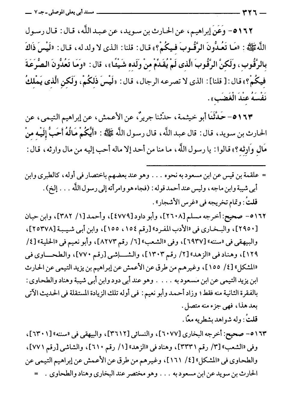 ٥١٦٣ - حَدَّثَنَا أبو خيثمة، حدّثنا جريرٌ، عن الأعمش، عن إبراهيم التيمي، عن الحارث بن سويد، قال: قال عبد الله، قال رسول الله - صلى الله عليه وسلم -: "أَيُّكُمْ مَالُهُ أَحَبُّ إلَيْهِ مِنْ مَالِ وَارِثِهِ؟ " قالوا: يا رسول الله، ما منا من أحد إلا ماله أحب إليه من مال وارثه، قال: