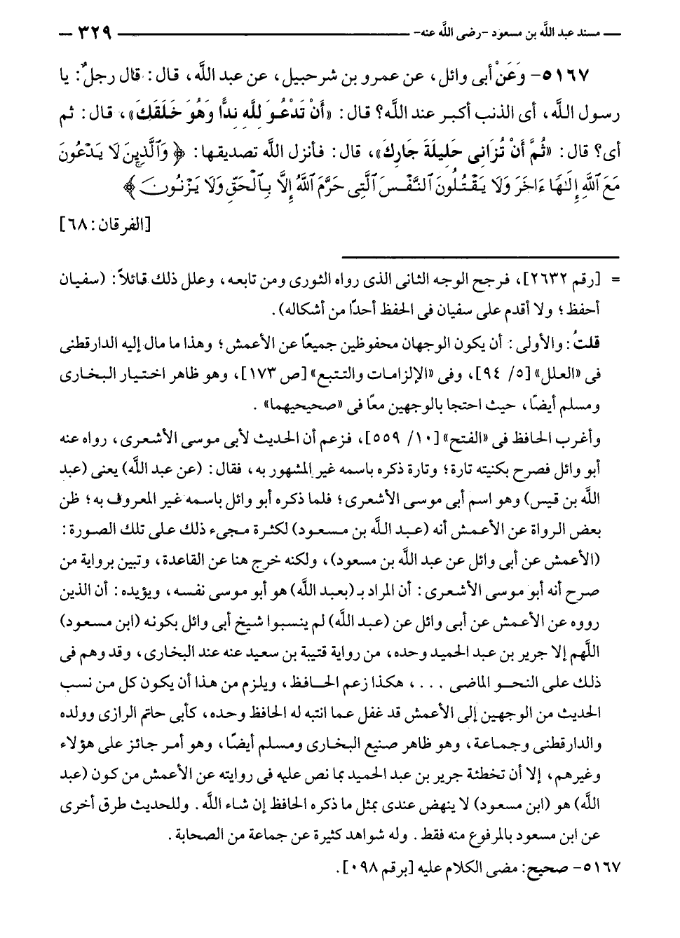 ٥١٦٧ - وَعَنْ أبي وائل، عن عمرو بن شرحبيل، عن عبد الله، قال: قال رجلٌ: يا رسول الله، أي الذنب أكبر عند الله؟ قال: "أَنْ تَدْعُوَ لِلَّهِ نِدًّا وَهُوَ خَلَقَكِ"، قال: ثم أي؟ قال: "ثُمَّ أَنْ تُزَانِى حَلِيلَةَ جَارِكَ"، قال: فأنزل الله تصديقها: {وَالَّذِينَ لَا يَدْعُونَ مَعَ اللَّهِ إِلَهًا آخَرَ وَلَا يَقْتُلُونَ النَّفْسَ الَّتِي حَرَّمَ اللَّهُ إِلَّا بِالْحَقِّ وَلَا يَزْنُونَ} [الفرقان: ٦٨].