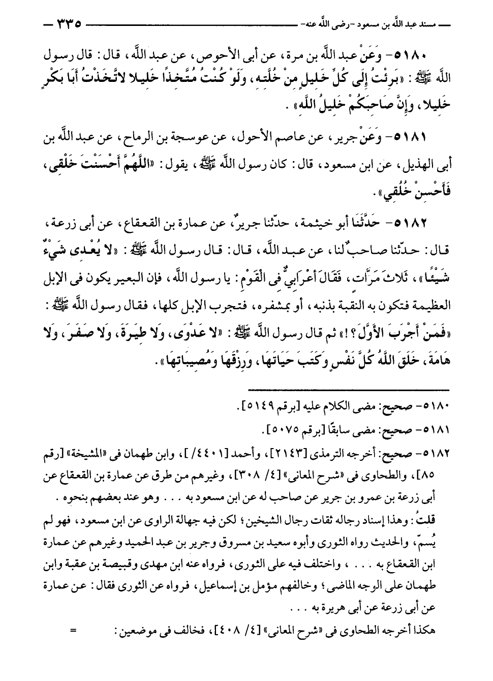 قلتُ: وهذا إسناد رجاله ثقات رجال الشيخين؛ لكن فيه جهالة الراوي عن ابن مسعود، فهو لم يُسمّ، والحديث رواه الثوري وأبوه سعيد بن مسروق وجرير بن عبد الحميد وغيرهم عن عمارة بن القعقاع به ... ، واختلف فيه على الثوري، فرواه عنه ابن مهدى وقبيصة بن عقبة وابن طهمان على الوجه الماضي؛ وخالفهم مؤمل بن إسماعيل، فرواه عن الثوري فقال: عن عمارة عن أبي زرعة عن أبي هريرة به ...