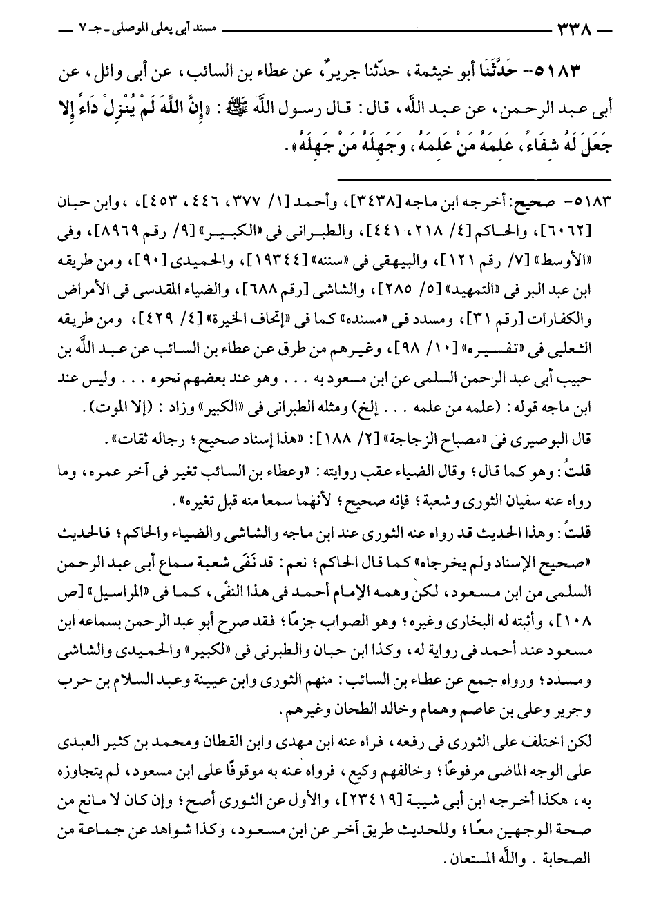 ٥١٨٣ - حَدَّثَنَا أبو خيثمة، حدّثنا جريرٌ، عن عطاء بن السائب، عن أبي وائل، عن أبي عبد الرحمن، عن عبد الله، قال: قال رسول الله - صلى الله عليه وسلم -: "إِنَّ اللَّهَ لَمْ يُنْزِلْ دَاءً إِلا جَعَلَ لَهُ شِفَاءً، عَلِمَهُ مَنْ عَلِمَهُ، وَجَهِلَهُ مَنْ جَهِلَهُ".