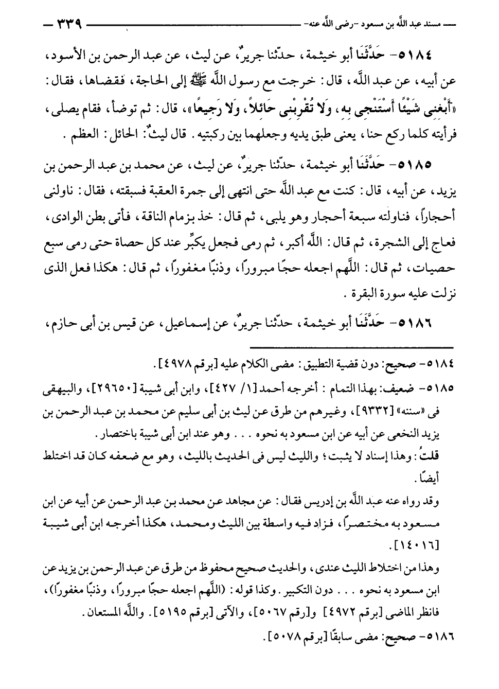 ٥١٨٥ - حَدَّثَنَا أبو خيثمة، حدّثنا جريرٌ، عن ليث، عن محمد بن عبد الرحمن بن يزيد، عن أبيه، قال: كنت مع عبد الله حتى انتهى إلى جمرة العقبة فسبقته، فقال: ناولنى أحجارًا، فناولته سبعة أحجار وهو يلبى، ثم قال: خذ بزمام الناقة، فأتى بطن الوادى، فعاج إلى الشجرة، ثم قال: الله أكبر، ثم رمى فجعل يكبِّر عند كل حصاة حتى رمى سبع حصيات، ثم قال: اللَّهم اجعله حجًا مبرورًا، وذنبًا مغفورًا، ثم قال: هكذا فعل الذي نزلت عليه سورة البقرة.