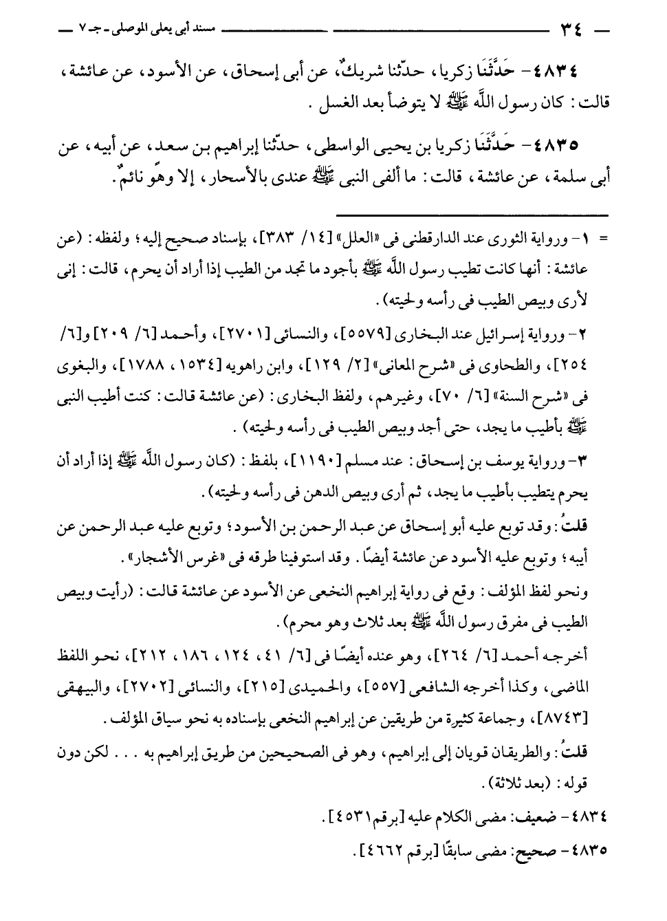 ٤٨٣٤ - حَدَّثَنَا زكريا، حدّثنا شريكٌ، عن أبى إسحاق، عن الأسود، عن عائشة، قالت: كان رسول الله - صلى الله عليه وسلم - لا يتوضأ بعد الغسل.