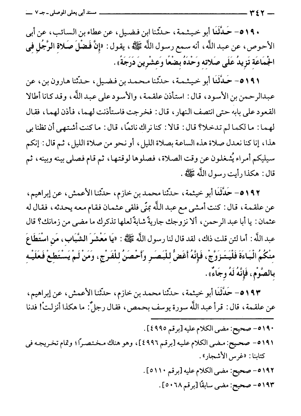 ٥١٩٠ - حَدَّثَنَا أبو خيثمة، حدّثنا ابن فضيل، عن عطاء بن السائب، عن أبى الأحوص، عن عبد الله، أنه سمع رسول الله - صلى الله عليه وسلم -، يقول: "إِنَّ فَضْلَ صَلاةِ الرَّجُلِ فِي الجمَاعَةِ تَزِيدُ عَلَى صَلاتِهِ وَحْدَهُ بِضْعًا وَعِشْرِينَ دَرَجَةً".