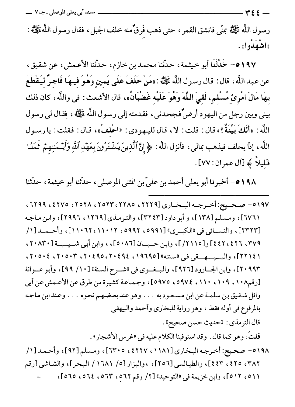 ٥١٩٧ - حَدَّثَنَا أبو خيثمة، حدّثنا محمد بن خازم، حدّثنا الأعمش، عن شقيق، عن عبد الله، قال: قال رسول الله - صلى الله عليه وسلم -: "مَنْ حَلَفَ عَلَى يَمِينٍ وَهُوَ فِيهَا فَاجِرٌ لِيَقْطَعَ بِهَا مَالَ امْرِئٍ مُسْلِمٍ، لَقِيَ اللهَ وَهُوَ عَلَيْهِ غَضْبَانٌ"، قال الأشعث: في واللَّه، كان ذلك بينى وبين رجل من اليهود أرضٌ فجحدنى، فقدمته إلى رسول الله - صلى الله عليه وسلم -، فقال لى رسول الله: "أَلَكَ بَيِّنَةٌ؟ " قال: قلت: لا، قال لليهودى: "احْلِفْ"، قال: فقلت: يا رسول الله، إذًا يحلف فيذهب بمالى، فأنزل الله: {إِنَّ الَّذِينَ يَشْتَرُونَ بِعَهْدِ اللَّهِ وَأَيْمَانِهِمْ ثَمَنًا قَلِيلًا} [آل عمران: ٧٧].