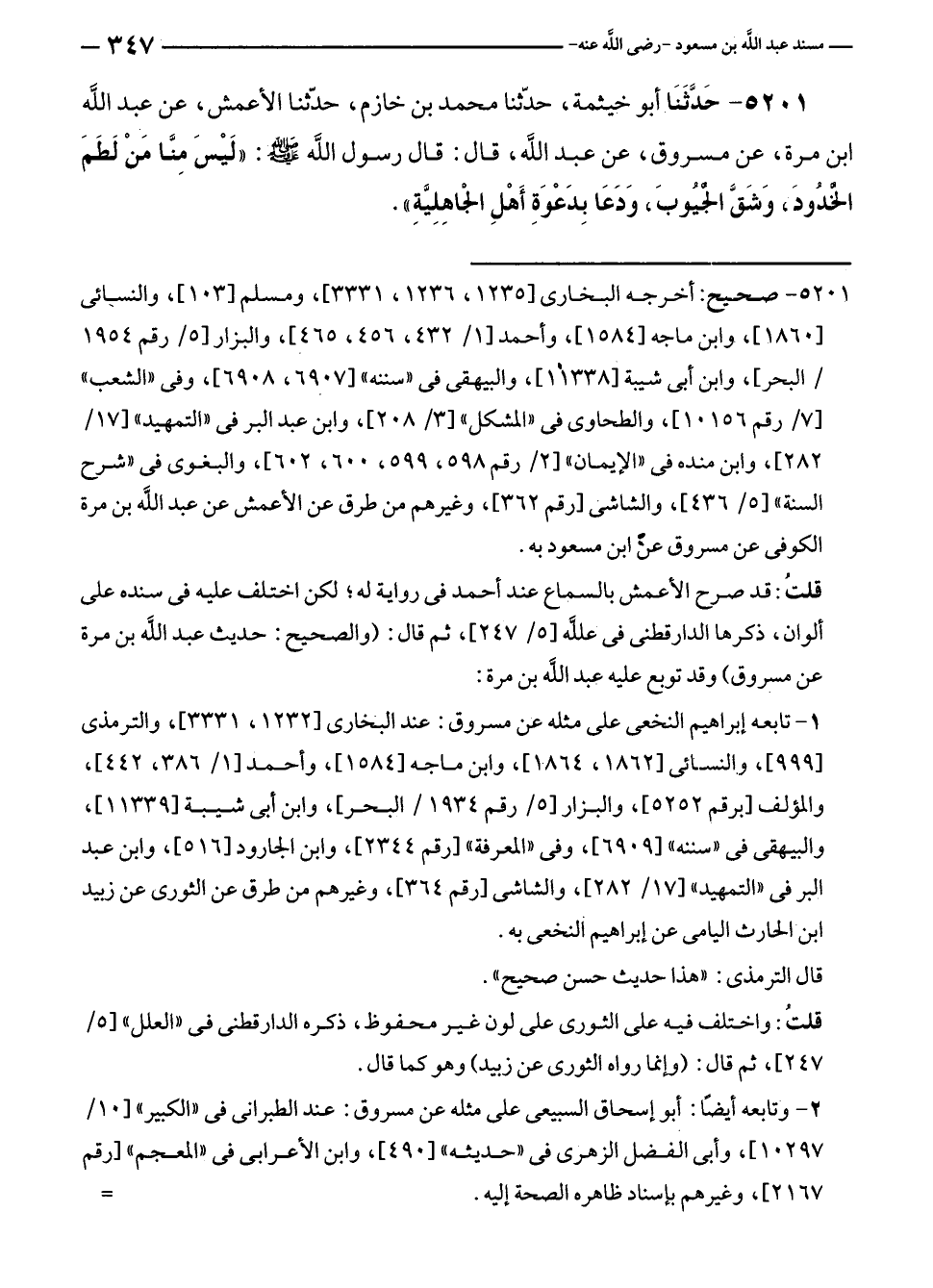 ٥٢٠١ - حَدَّثَنَا أبو خيثمة، حدّثنا محمد بن خازم، حدّثنا الأعمش، عن عبد الله بن مرة، عن مسروق، عن عبد الله، قال: قال رسول الله - صلى الله عليه وسلم -: "لَيْسَ مِنَّا مَنْ لَطَمَ الخُدُودَ، وَشَقَّ الجيُوبَ، وَدَعَا بِدَعْوَةِ أَهْلِ الجاهِلِيَّةِ".