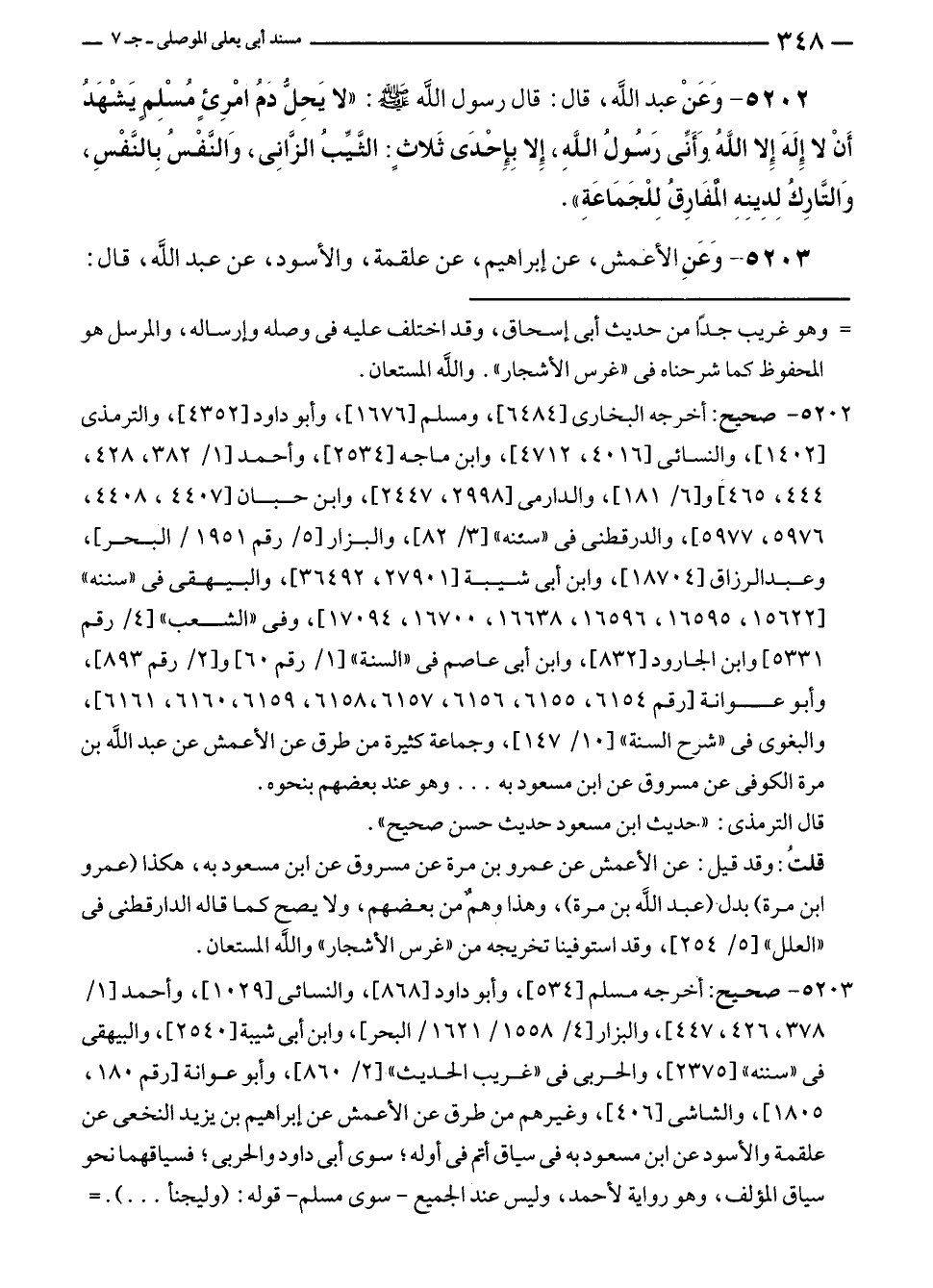 قلتُ: وقد قيل: عن الأعمش عن عمرو بن مرة عن مسروق عن ابن مسعود به، هكذا (عمرو بن مرة) بدل (عبد الله بن مرة)، وهذا وهمٌ من بعضهم، ولا يصح كما قاله الدارقطنى في "العلل" [٥/ ٢٥٤]، وقد استوفينا تخريجه من "غرس الأشجار" والله المستعان.