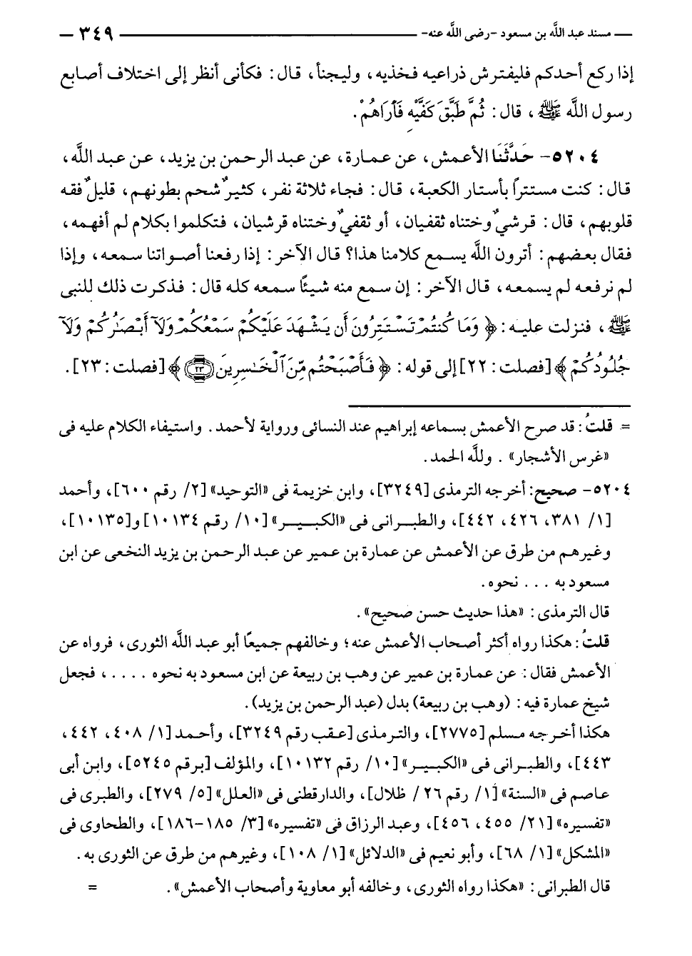 ٥٢٠٤ - حَدَّثَنَا الأعمش، عن عمارة، عن عبد الرحمن بن يزيد، عن عبد الله، قال: كنت مستترًا بأستار الكعبة، قال: فجاء ثلاثة نفر، كثيرٌ شحم بطونهم، قليلٌ فقه قلوبهم، قال: قرشيٌ وختناه ثقفيان، أو ثقفيٌ وختناه قرشيان، فتكلموا بكلام لم أفهمه، فقال بعضهم: أترون الله يسمع كلامنا هذا؟ قال الآخر: إذا رفعنا أصواتنا سمعه، وإذا لم نرفعه لم يسمعه، قال الآخر: إن سمع منه شيئًا سمعه كله قال: فذكرت ذلك للنبى - صلى الله عليه وسلم -، فنزلت عليه: {وَمَا كُنْتُمْ تَسْتَتِرُونَ أَنْ يَشْهَدَ عَلَيْكُمْ سَمْعُكُمْ وَلَا أَبْصَارُكُمْ وَلَا جُلُودُكُمْ} [فصلت: ٢٢] إلى قوله: {فَأَصْبَحْتُمْ مِنَ الْخَاسِرِينَ (٢٣)} [فصلت: ٢٣].