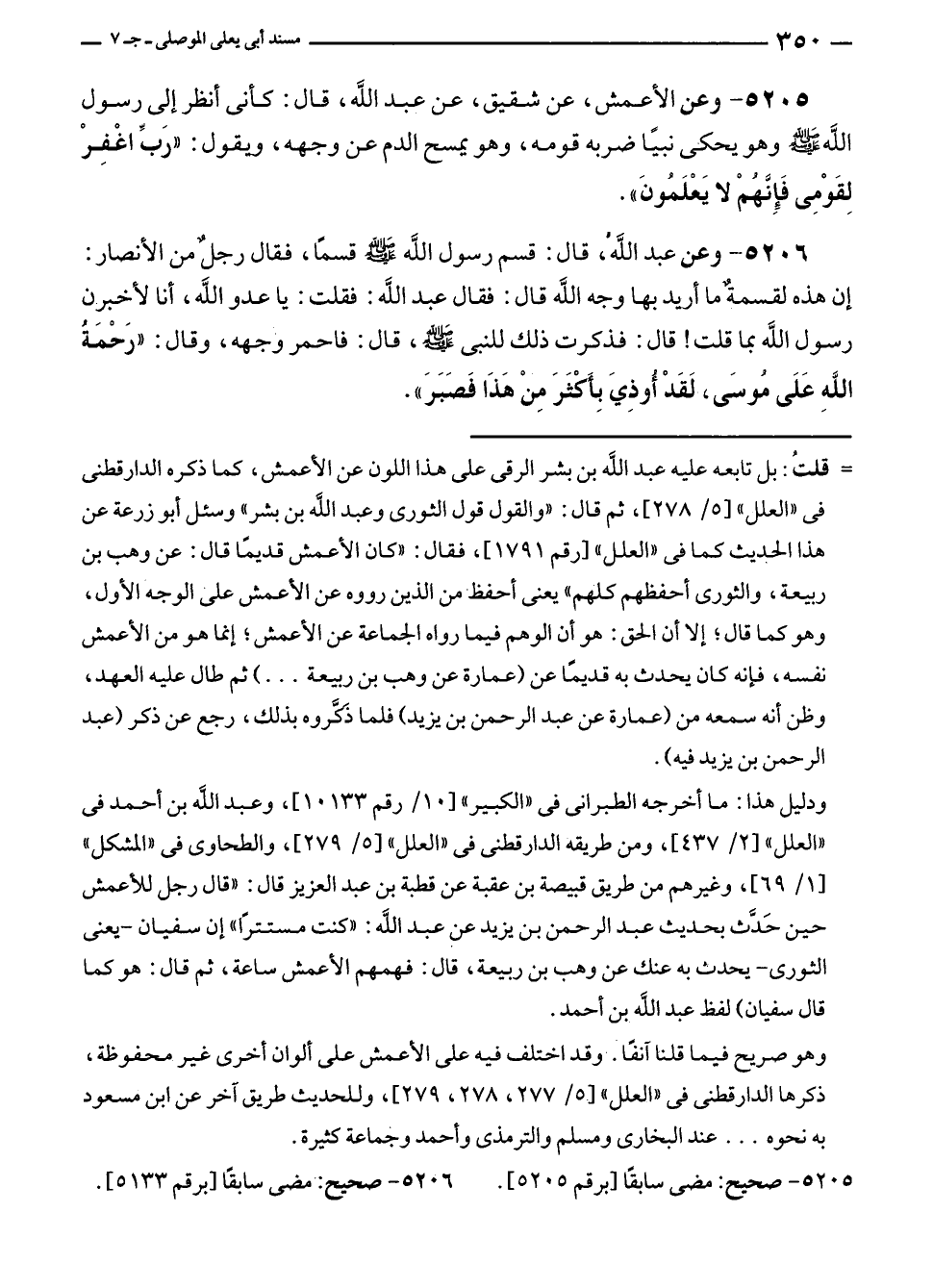 ٥٢٠٥ - وعن الأعمش، عن شقيق، عن عبد الله، قال: كأنى أنظر إلى رسول الله - صلى الله عليه وسلم - وهو يحكى نبيًا ضربه قومه، وهو يمسح الدم عن وجهه، ويقول: "رَبِّ اغْفِرْ لِقَوْمِى فَإِنَّهُمْ لا يَعْلَمُونَ".