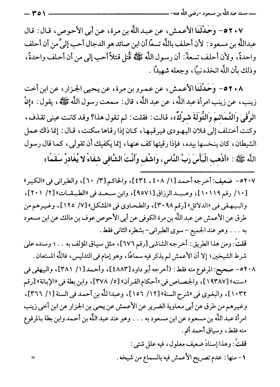 ٥٢٠٨ - وَحَدَّثَنَا الأعمش، عن عمرو بن مرة، عن يحيى الجزار، عن ابن أخت زينب، عن زينب امرأة عبد الله، عن عبد الله، قال: سمعت رسول الله - صلى الله عليه وسلم -، يقول: "إِنَّ الرُّقَى وَالتَّمَائِمَ وَالتُّوَلَةَ شِرْكٌ"، قالت: فقلت: لم تقول هذا؟ وقد كانت عينى تقذف، وكنت أختلف إلى فلان اليهودى فيرقيها، كان إذا رقاها سكنت، قال: إنما ذاك عمل الشيطان، كان ينخسها بيده، فإذا رقيتها كف عنها، إنما يكفيك أن تقولى، كما قال رسول الله - صلى الله عليه وسلم -: "أَذْهِبِ الْبَأْسَ رَبَّ النَّاسِ، وَاشْفِ وَأَنْتَ الشَّافِى شِفَاءً لا يُغَادِرُ سَقَمًا".