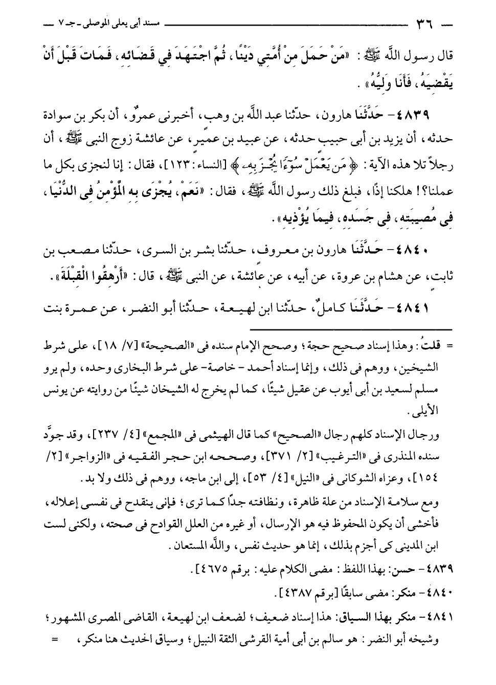 ٤٨٣٩ - حَدَّثَنَا هارون، حدّثنا عبد الله بن وهبٍ، أخبرنى عمرٌو، أن بكر بن سوادة حدثه، أن يزيد بن أبى حبيب حدثه، عن عبيد بن عمير، عن عائشة زوج النبي - صلى الله عليه وسلم -، أن رجلًا تلا هذه الآية: {مَنْ يَعْمَلْ سُوءًا يُجْزَ بِهِ} [النساء: ١٢٣]، فقال: إنا لنجزى بكل ما عملنا؟! هلكنا إذا، فبلغ ذلك رسول الله - صلى الله عليه وسلم -، فقال: "نَعَمْ، يُجْزَى بِهِ الْمؤْمِنُ فِي الدُّنْيَا، فِي مُصِيبَتِهِ، فِي جَسَدِهِ، فِيمَا يُؤْذِيهِ".