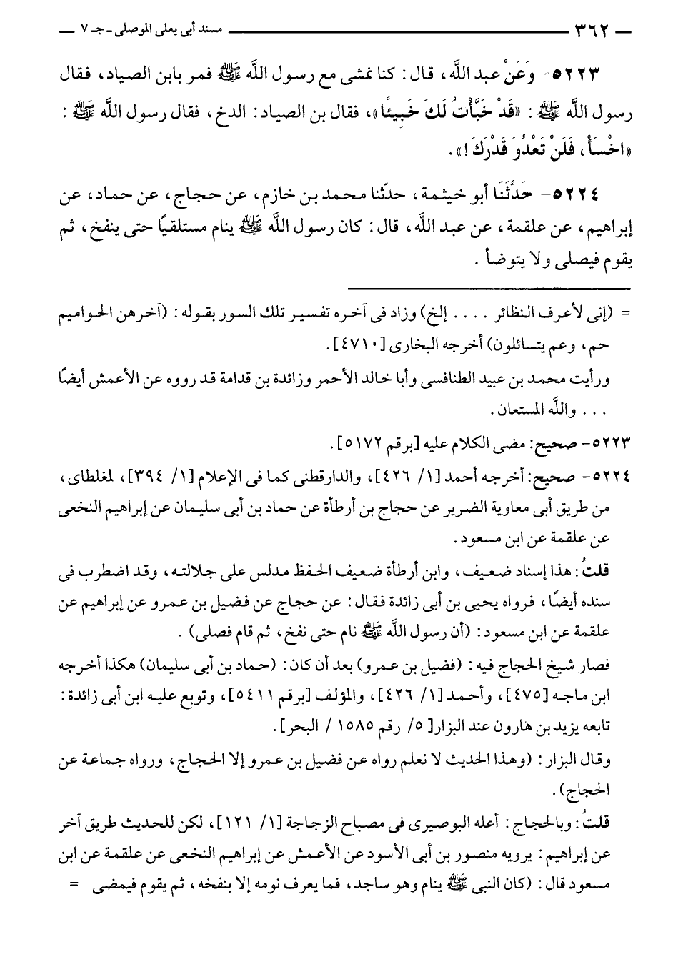 ٥٢٢٤ - حَدَّثَنَا أبو خيثمة، حدّثنا محمد بن خازم، عن حجاج، عن حماد، عن إبراهيم، عن علقمة، عن عبد الله، قال: كان رسول الله - صلى الله عليه وسلم - ينام مستلقيًا حتى ينفخ، ثم يقوم فيصلى ولا يتوضأ.