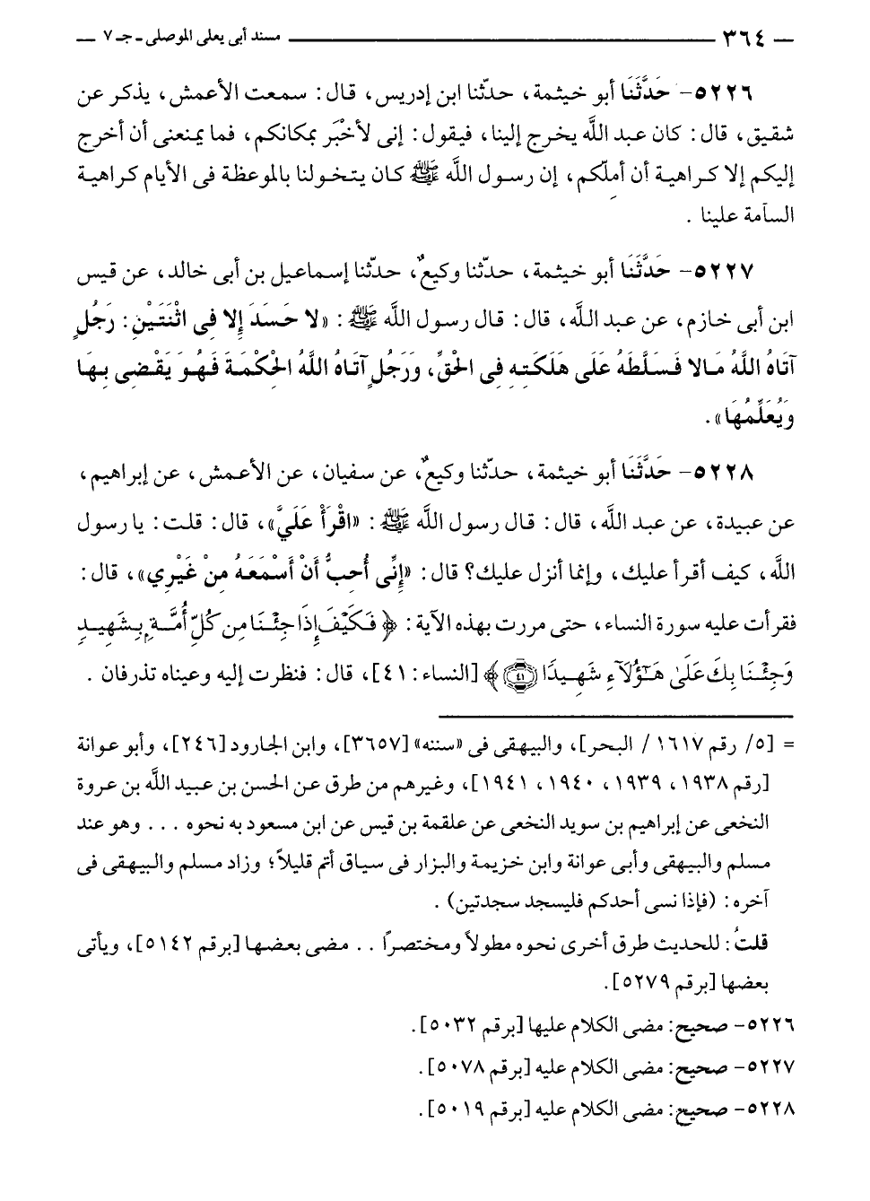 ٥٢٢٨ - حَدَّثَنَا أبو خيثمة، حدّثنا وكيعٌ، عن سفيان، عن الأعمش، عن إبراهيم، عن عبيدة، عن عبد الله، قال: قال رسول الله - صلى الله عليه وسلم -: "اقْرَأْ عَلَيَّ"، قال: قلت: يا رسول الله، كيف أقرأ عليك، وإنما أنزل عليك؟ قال: "إِنِّى أحِبُّ أَنْ أَسْمَعَهُ مِنْ غَيْرِي"، قال: فقرأت عليه سورة النساء، حتى مررت بهذه الآية: {فَكَيْفَ إِذَا جِئْنَا مِنْ كُلِّ أُمَّةٍ بِشَهِيدٍ وَجِئْنَا بِكَ عَلَى هَؤُلَاءِ شَهِيدًا (٤١)} [النساء: ٤١] قال: فنظرت إليه وعيناه تذرفان.