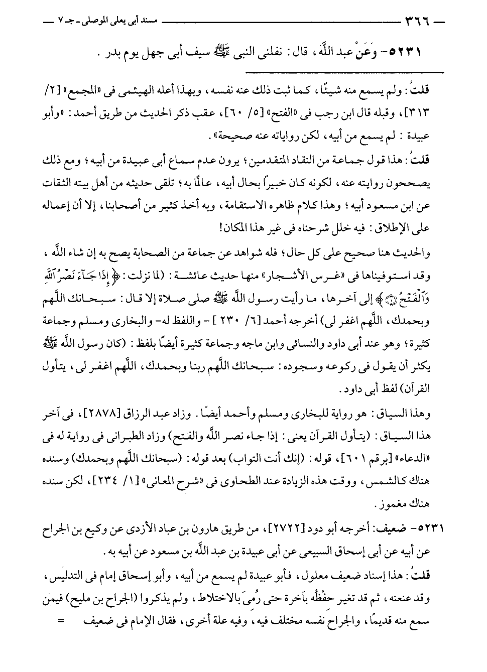 قلتُ: هذا قول جماعة من النقاد المتقدمين؛ يرون عدم سماع أبى عبيدة من أبيه؛ ومع ذلك يصححون روايته عنه، لكونه كان خبيرًا بحال أبيه، عالمًا به؛ تلقى حديثه من أهل بيته الثقات عن ابن مسعود أبيه؛ وهذا كلام ظاهره الاستقامة، وبه أخذ كثير من أصحابنا، إلا أن إعماله على الإطلاق: فيه خلل شرحناه في غير هذا المكان!