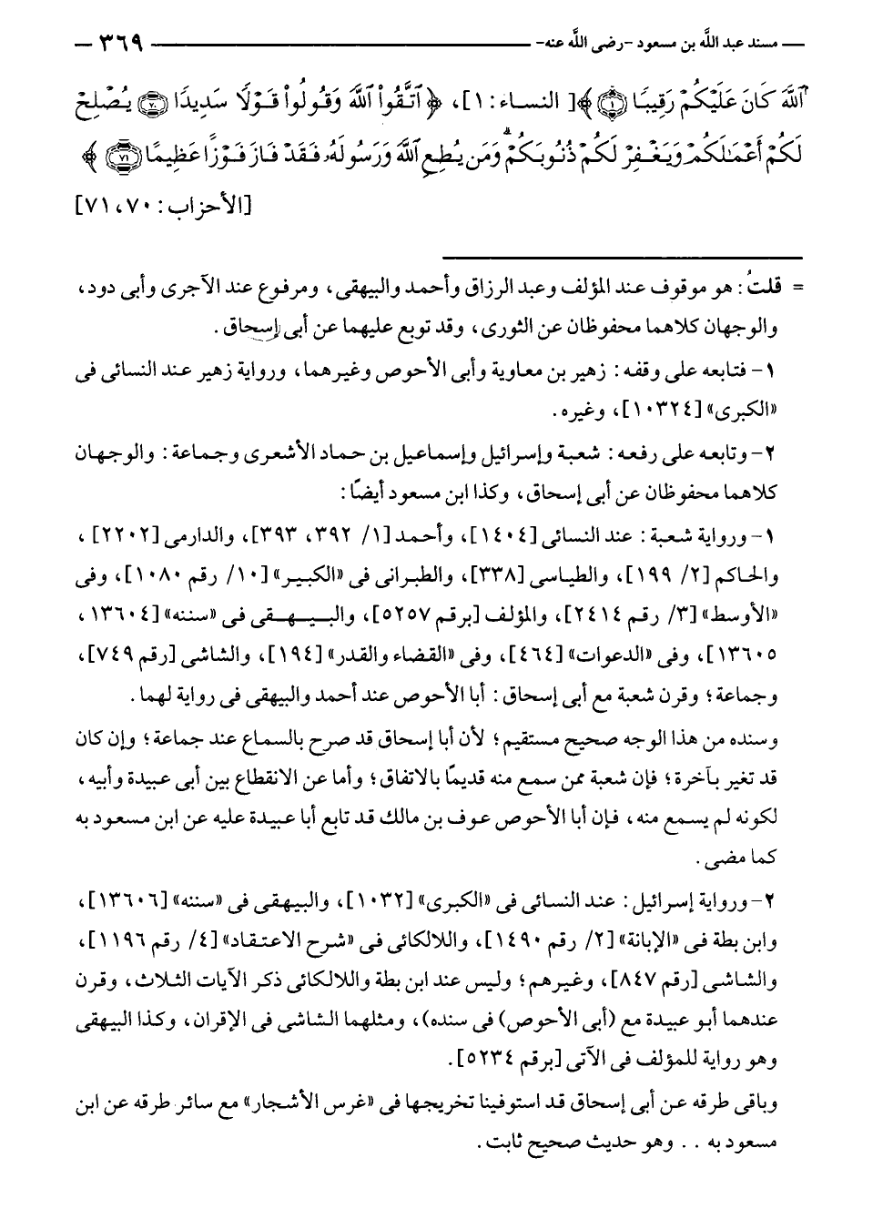 وسنده من هذا الوجه صحيح مستقيم؛ لأن أبا إسحاق قد صرح بالسماع عند جماعة؛ وإن كان قد تغير بآخرة؛ فإن شعبة ممن سمع منه قديمًا بالاتفاق؛ وأما عن الانقطاع بين أبى عبيدة وأبيه، لكونه لم يسمع منه، فإن أبا الأحوص عوف بن مالك قد تابع أبا عبيدة عليه عن ابن مسعود به كما مضى.