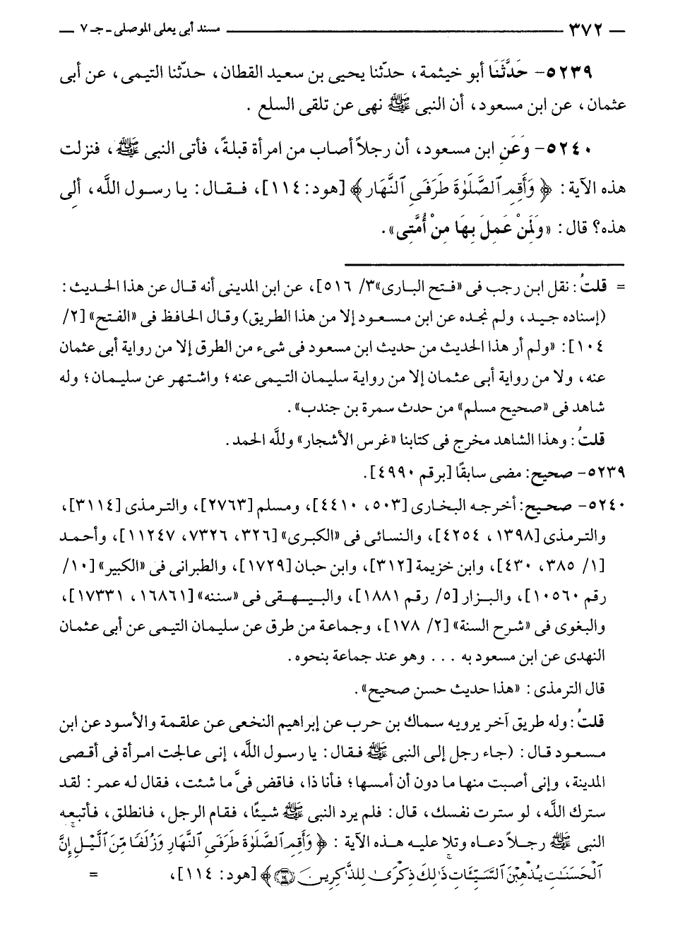 ٥٢٤٠ - وَعَنِ ابن مسعود، أن رجلًا أصاب من امرأة قبلةً، فأتى النبي - صلى الله عليه وسلم -، فنزلت هذه الآية: {وَأَقِمِ الصَّلَاةَ طَرَفَيِ النَّهَارِ} [هود: ١١٤]، فقال: يا رسول الله، ألِى هذه؟ قال: "وَلمِنْ عَمِلَ بِهَا مِنْ أُمَتِى".