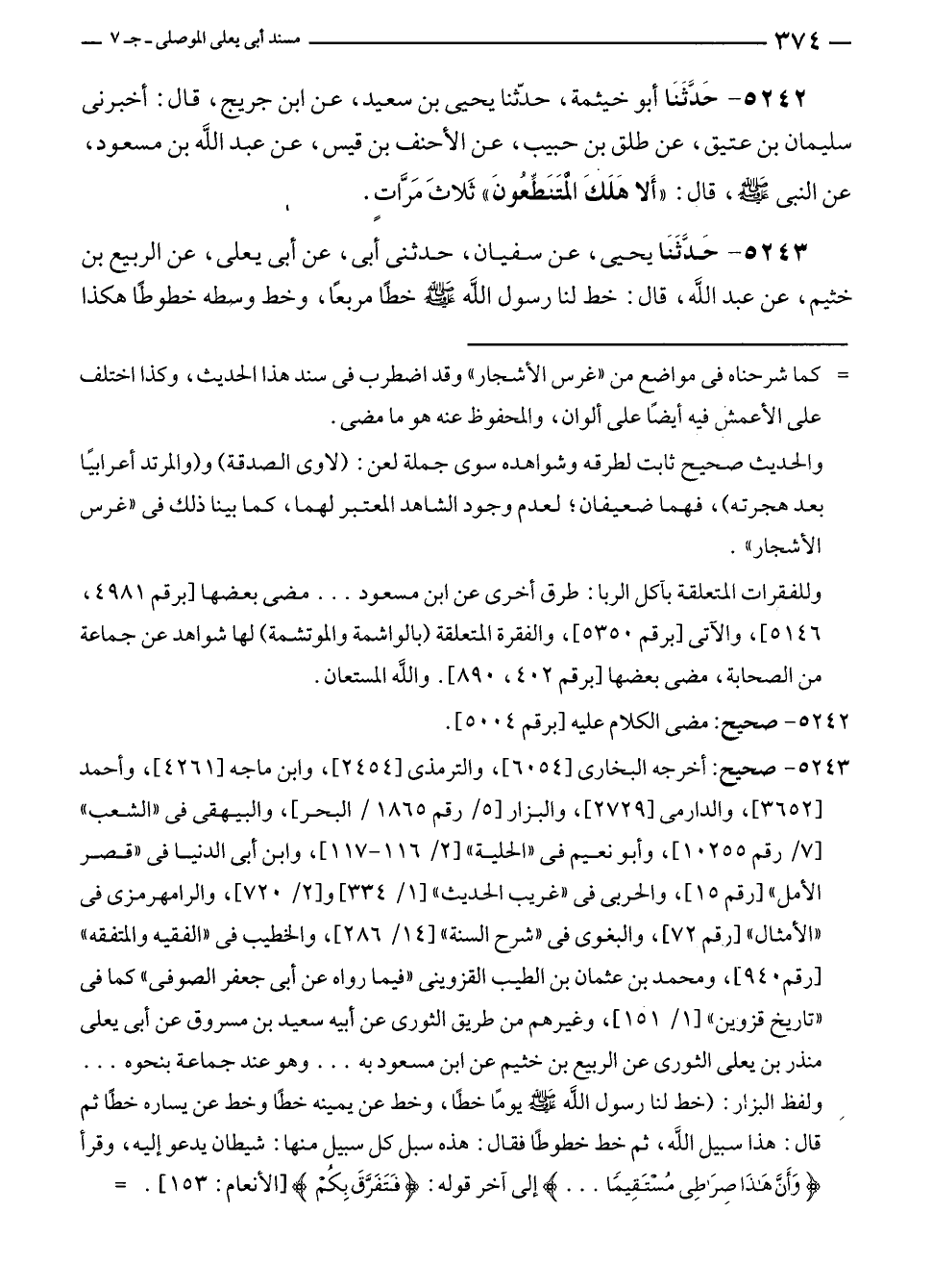 ٥٢٤٣ - صحيح: أخرجه البخارى [٦٠٥٤]، والترمذى [٢٤٥٤]، وابن ماجه [٤٢٦١]، وأحمد [٣٦٥٢]، والدارمى [٢٧٢٩]، والبزار [٥/ رقم ١٨٦٥/ البحر]، والبيهقى في "الشعب" [٧/ رقم ١٠٢٥٥]، وأبو نعيم في "الحلية" [٢/ ١١٦ - ١١٧]، وابن أبى الدنيا في "قصر الأمل" [رقم ١٥]، والحربى في "غريب الحديث" [١/ ٣٣٤]، و [٢/ ٧٢٠]، والرامهرمزى في "الأمثال" [رقم ٧٢]، والبغوى في "شرح السنة" [١٤/ ٢٨٦]، والخطيب في "الفقيه والمتفقه" [رقم ٩٤٠]، ومحمد بن عثمان بن الطيب القزوينى "فيما رواه عن أبى جعفر الصوفى" كما في "تاريخ قزوين" [١/ ١٥١]، وغيرهم من طريق الثورى عن أبيه سعيد بن مسروق عن أبى يعلى منذر بن يعلى الثورى عن الربيع بن خثيم عن ابن مسعود به ... وهو عند جماعة بنحوه ... ولفظ البزار: (خط لنا رسول الله - صلى الله عليه وسلم - يومًا خطًا، وخط عن يمينه خطًا وخط عن يساره خطًا ثم قال: هذا سبيل الله، ثم خط خطوطًا فقال: هذه سبل كل سبيل منها: شيطان يدعو إليه، وقرأ {وَأَنَّ هَذَا صِرَاطِي مُسْتَقِيمًا} إلى آخر قوله: {فَتَفَرَّقَ بِكُمْ} [الأنعام: ١٥٣]. =