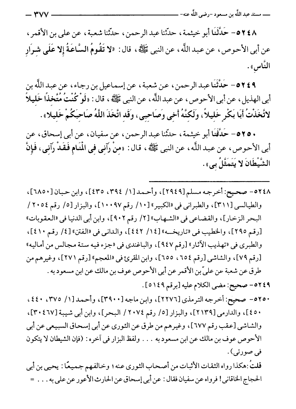 ٥٢٤٨ - صحيح: أخرجه مسلم [٢٩٤٩]، وأحمد [١/ ٣٩٤، ٤٣٥]، وابن حبان [٦٨٥٠]، والطيالسى [٣١١]، والطبرانى في "الكبير" [١٠/ رقم ١٠٠٩٧]، والبزار [٥/ رقم ٢٠٥٤/ البحر الزخار]، والقضاعى في "الشهاب" [٢/ رقم ٩٠٢]، وابن أبى الدنيا في "العقوبات" [رقم ٢٩٥]، والخطيب في "تاريخه" [١٤/ ٤٤٢]، والدانى في "الفتن" [٤/ رقم ٤١٠]، والطبرى في "تهذيب الآثار" [رقم ٩٤٧]، والباغندى في "جزء فيه ستة مجالس من أماليه" [رقم ٧٩]، والشاشى [رقم ٦٥٤، ٦٥٥]، وابن المقرئ في "المعجم" [رقم ٢٧١]، وغيرهم من طرق عن شعبة عن عليّ بن الأقمر عن أبى الأحوص عوف بن مالك عن ابن مسعود به.