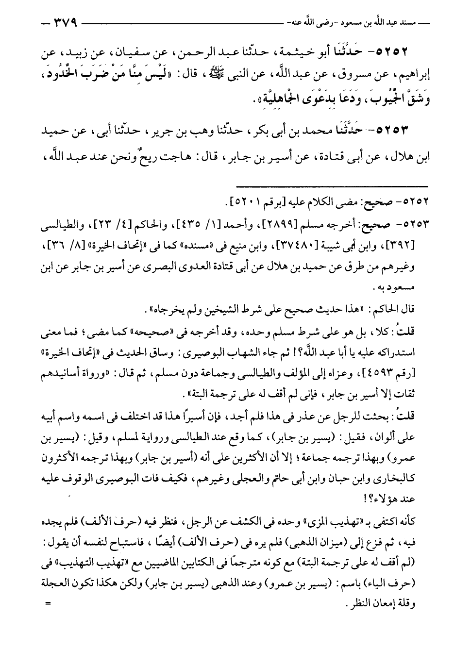 ٥٢٥٢ - حَدَّثَنَا أبو خيثمة، حدّثنا عبد الرحمن، عن سفيان، عن زبيد، عن إبراهيم، عن مسروق، عن عبد الله، عن النبي - صلى الله عليه وسلم -، قال: "لَيْسَ مِنَّا مَنْ ضَربَ الخُدُودَ، وَشَقَّ الجيُوبَ، وَدَعَا بِدَعْوَى الجاهِلِيَّةِ".