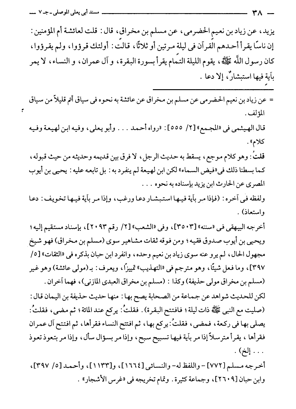 يزيد، عن زياد بن نعيمٍ الحضرمى، عن مسلم بن مخراقٍ، قال: قلت لعائشة أم المؤمنين: إن ناسًا يقرأ أحدهم القرآن في ليلة مرتين أو ثلاثًا، قالت: أولئك قرؤوا، ولم يقرؤوا، كان رسول الله - صلى الله عليه وسلم -، يقوم الليلة التمام يقرأ بسورة البقرة، وآل عمران، والنساء، لا يمر بآيةٍ فيها استبشارٌ، إلا دعا.