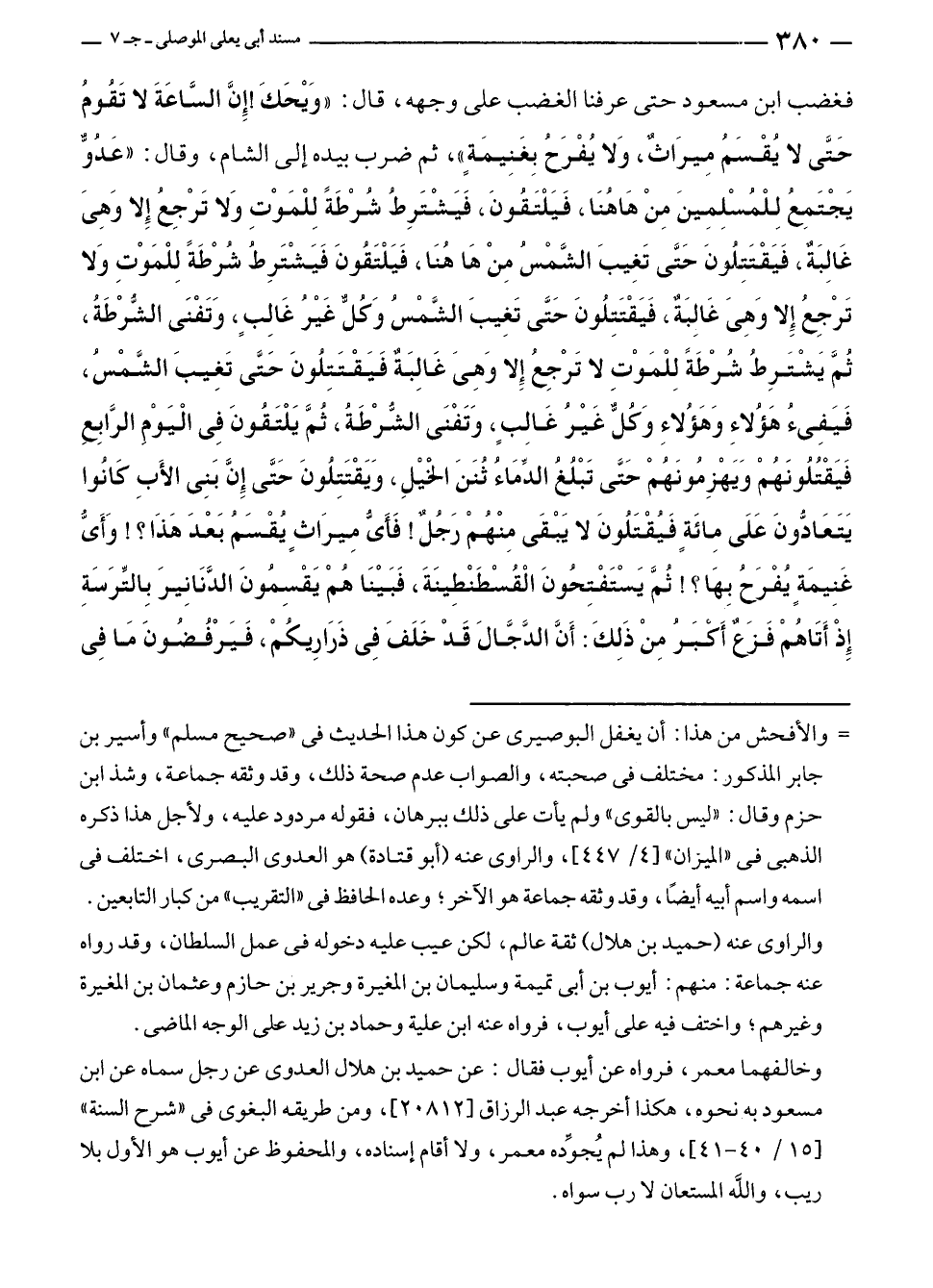 فغضب ابن مسعود حتى عرفنا الغضب على وجهه، قال: "وَيْحَكَ! إِنَّ السَّاعَةَ لا تَقُومُ حَتَّى لا يُقْسَمُ مِيرَاثٌ، وَلا يُفْرَحُ بِغَنِيمَةٍ"، ثم ضرب بيده إلى الشام، وقال: "عَدُوٌّ يَجْتَمِعُ لِلْمُسْلِمِينَ مِنْ هَاهُنَا، فَيَلْتَقُونَ، فَيَشْتَرِطُ شُرْطَةً لِلْمَوْتِ وَلا تَرْجِعُ إِلا وَهِىَ غَالِبَةٌ، فَيَقْتَتِلُونَ حَتَّى تَغِيبَ الشَّمْسُ مِنْ هَا هُنَا، فَيَلْتَقُونَ فَيَشْتَرِطُ شُرْطَةً لِلْمَوْتِ وَلا تَرْجِعُ إِلا وَهِىَ غَالِبَةٌ، فَيَقْتَتِلُونَ حَتَّى تَغِيبَ الشَّمْسُ وَكُلٌّ غَيْرُ غَالِبٍ، وَتَفْنَى الشُّرْطَةُ، ثُمَّ يَشْتَرِطُ شُرْطَةً لِلْمَوْتِ لا تَرْجِعُ إِلا وَهِىَ غَالِبَةٌ فَيَقْتَتِلُونَ حَتَّى تَغِيبَ الشَّمْسُ، فَيَفِئُ هَؤُلاءِ وَهَؤُلاءِ وَكُلٌّ غَيْرُ غَالِبٍ، وَتَفْنَى الشُّرْطَةُ، ثُمَّ يَلْتَقُونَ فِي الْيَوْمِ الرَّابِعِ فَيَقْتُلُونَهُمْ وَيَهْزِمُونَهُمْ حَتَّى تَبْلُغُ الدِّمَاءُ ثُنَنَ الخيْلِ، وَيَقْتَتِلُونَ حَتَّى إِنَّ بَنِي الأَبِ كَانُوا يَتَعَادُّونَ عَلَى مِائَةٍ فَيُقْتَلُونَ لا يَبْقَى مِنْهُمْ رَجُلٌ! فَأيُّ مِيرَاثٍ يُقْسَمُ بَعْدَ هَذَا؟! وَأَيُّ غَنِيمَةٍ يُفْرَحُ بِهَا؟! ثُمَّ يَسْتَفْتِحُونَ الْقُسْطَنْطِينَةَ، فَبَيْنَا هُمْ يَقْسِمُونَ الدَّنَانِيرَ بِالتِّرَسَةِ إِذ أَتَاهُمْ فَزَعٌ أَكبَرُ مِنْ ذَلِكَ: أَنَّ الدَّجَّالَ قَدْ خَلَفَ فِي ذَرَارِيكُمْ، فَيَرْفُضُدونَ مَا فِي