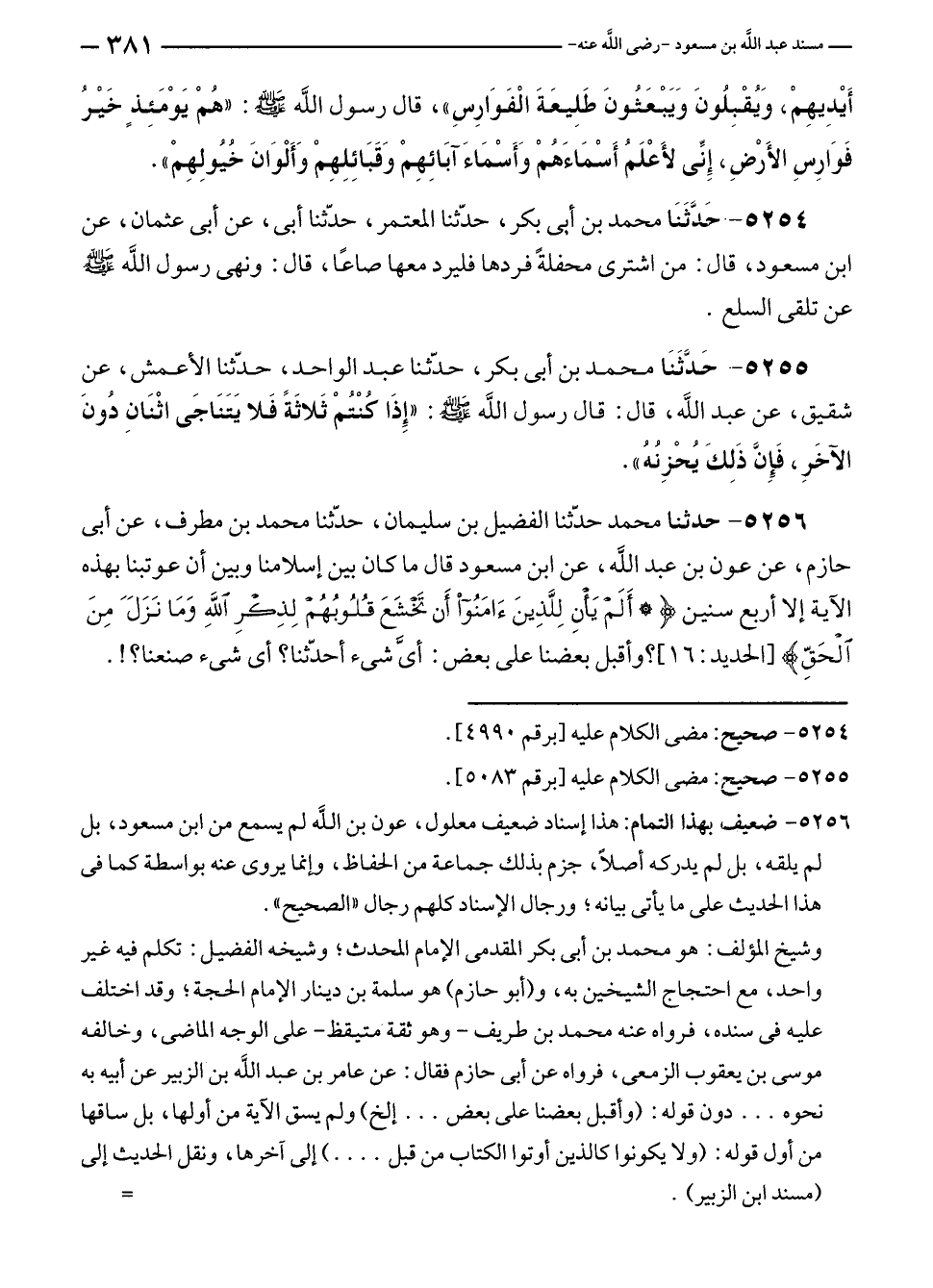٥٢٥٦ - حدثنا محمد حدّثنا الفضيل بن سليمان، حدّثنا محمد بن مطرف، عن أبى حازم، عن عون بن عبد الله، عن ابن مسعود قال ما كان بين إسلامنا وبين أن عوتبنا بهذه الآية إلا أربع سنين {أَلَمْ يَأْنِ لِلَّذِينَ آمَنُوا أَنْ تَخْشَعَ قُلُوبُهُمْ لِذِكْرِ اللَّهِ وَمَا نَزَلَ مِنَ الْحَقِّ} [الحديد: ١٦]؟ وأقبل بعضنا على بعض: أيَّ شئ أحدّثنا؟ أي شئ صنعنا؟!.