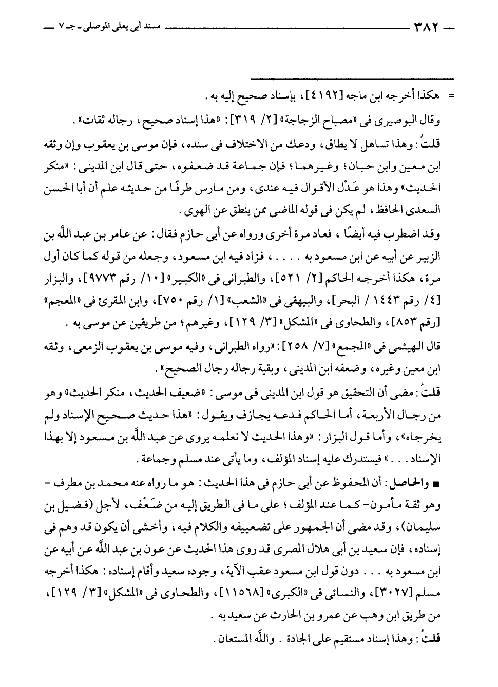 وقد اضطرب فيه أيضًا، فعاد مرة أخرى ورواه عن أبى حازم فقال: عن عامر بن عبد الله بن الزبير عن أبيه عن ابن مسعود به .... ، فزاد فيه ابن مسعود، وجعله من قوله كما كان أول مرة، هكذا أخرجه الحاكم [٢/ ٥٢١]، والطبرانى في "الكبير" [١٠/ رقم ٩٧٧٣]، والبزار [٤/ رقم ١٤٤٣/ البحر]، والبيهقى في "الشعب" [١/ رقم ٧٥٠]، وابن المقرئ في "المعجم" [رقم ٨٥٣]، والطحاوى في "المشكل" [٣/ ١٢٩]، وغيرهم؛ من طريقين عن موسى به.