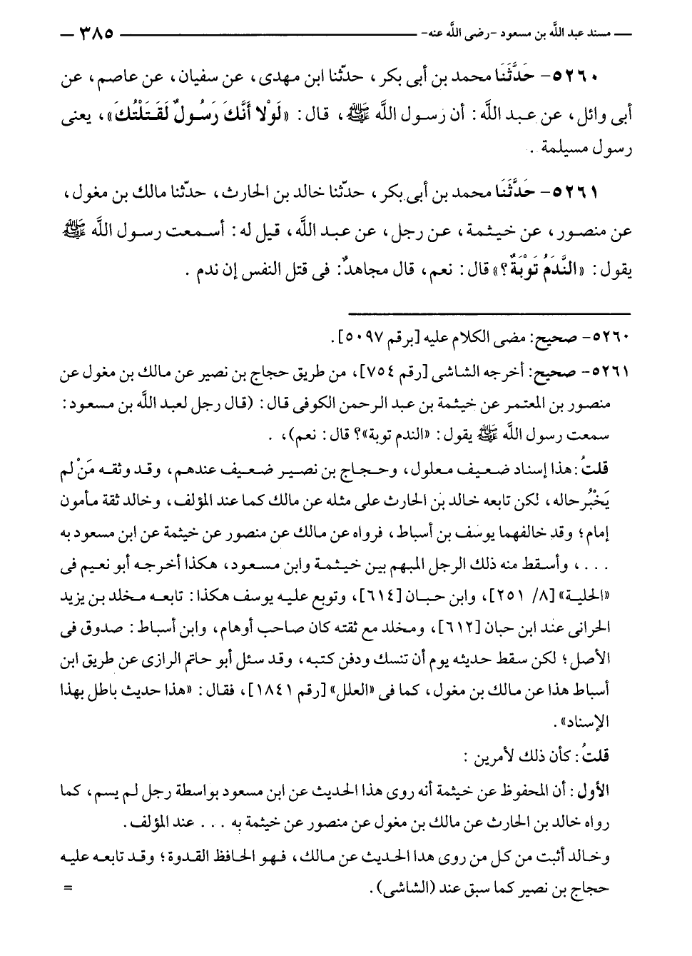٥٢٦١ - حَدَّثَنَا محمد بن أبى بكر، حدّثنا خالد بن الحارث، حدّثنا مالك بن مغول، عن منصور، عن خيثمة، عن رجل، عن عبد الله، قيل له: أسمعت رسول الله - صلى الله عليه وسلم - يقول: "النَّدَمُ تَوْبَةٌ؟ " قال: نعم، قال مجاهدٌ: في قتل النفس إن ندم.