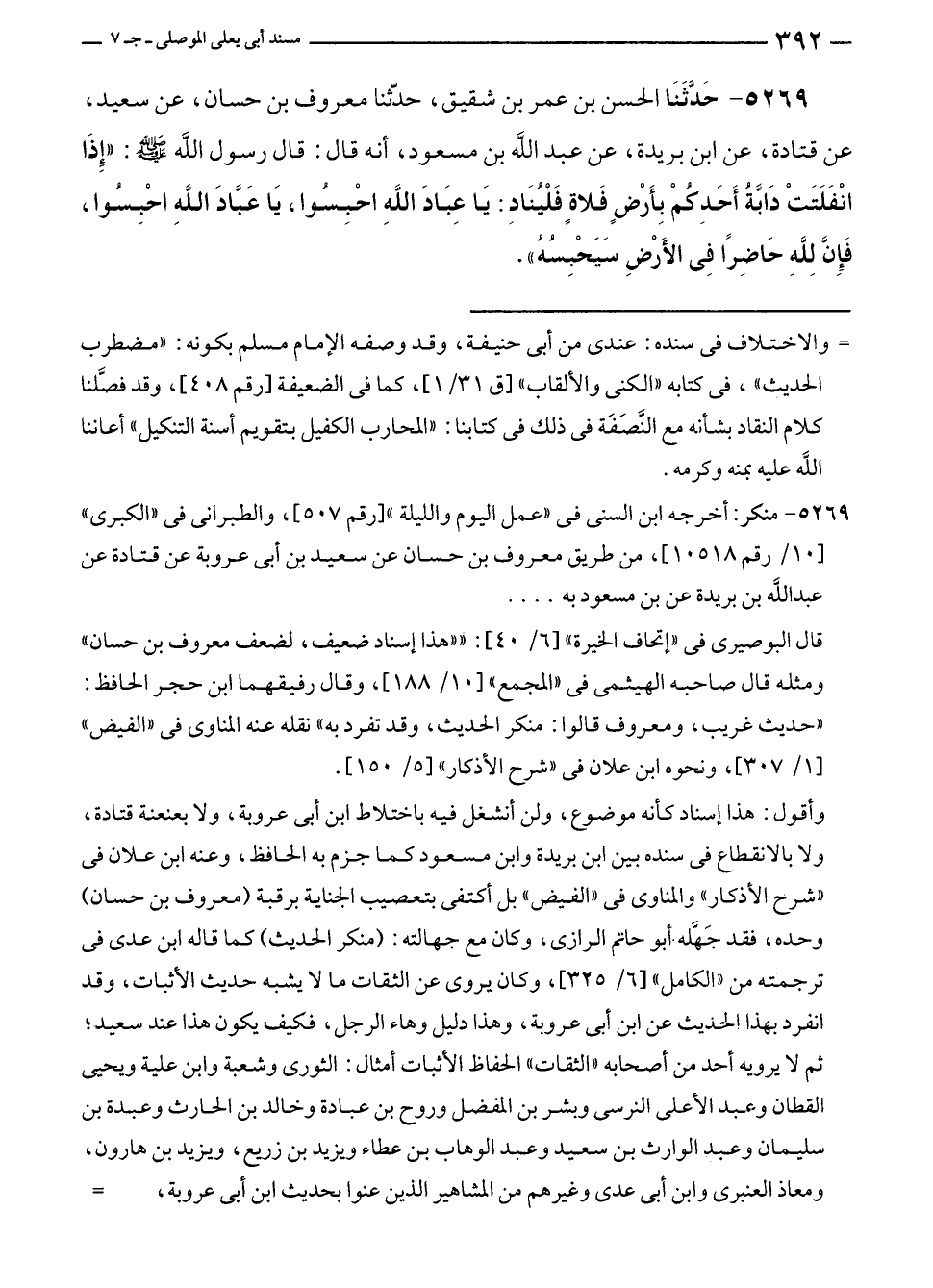 ٥٢٦٩ - حَدَّثَنَا الحسن بن عمر بن شقيق، حدّثنا معروف بن حسان، عن سعيد، عن قتادة، عن ابن بريدة، عن عبد الله بن مسعود، أنه قال: قال رسول الله - صلى الله عليه وسلم -: "إِذَا انْفَلَتَتْ دَابَّةُ أَحَدِكمْ بِأَرْضٍ فَلاةٍ فَلْيُنَادِ: يَا عِبَادَ اللَّهِ احْبِسُوا، يَا عَبَّادَ اللَّهِ احْبِسُوا، فَإِن لِلَّهِ حَاضِرًا فِي الأَرْضِ سَيَحْبِسُهُ".