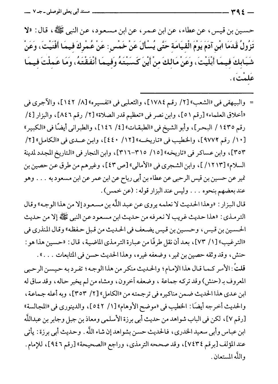= والبيهقى في "الشعب" [٢/ رقم ١٧٨٤]، والثعلبى في "تفسيره" [٨/ ١٤٢]، والآجرى في "أخلاق العلماء" [رقم ٥١]، وابن نصر في "تعظيم قدر الصلاة" [٢/ رقم ٨٤٦]، والبزار [٤/ رقم ١٤٣٥/ البحر]، وأبو الشيخ في "الطبقات" [٤/ ١٤٦]، والطبرانى أيضًا في "الكبير" [١٠/ رقم ٩٧٧٢]، والخطيب في "تاريخه" [١٢/ ٤٤٠]، وابن عدى في "الكامل" [٢/ ٣٥٣]، وابن عساكر في "تاريخه" [١٥/ ٣١٥ - ٣١٦]، وابن النجار في "التاريخ المجدد لمدينة السلام" [١٢١٣/]، وابن الشجرى في "الأمالى" [ص ٤٣]، وغيرهم من طرق عن حصين بن نمير عن حسين بن قيس الرحبى عن عطاء بن أبى رباح عن ابن عمر عن ابن مسعود به ... وهو عند بعضهم بنحوه ... وليس عند البزار قوله: (عن خمس).