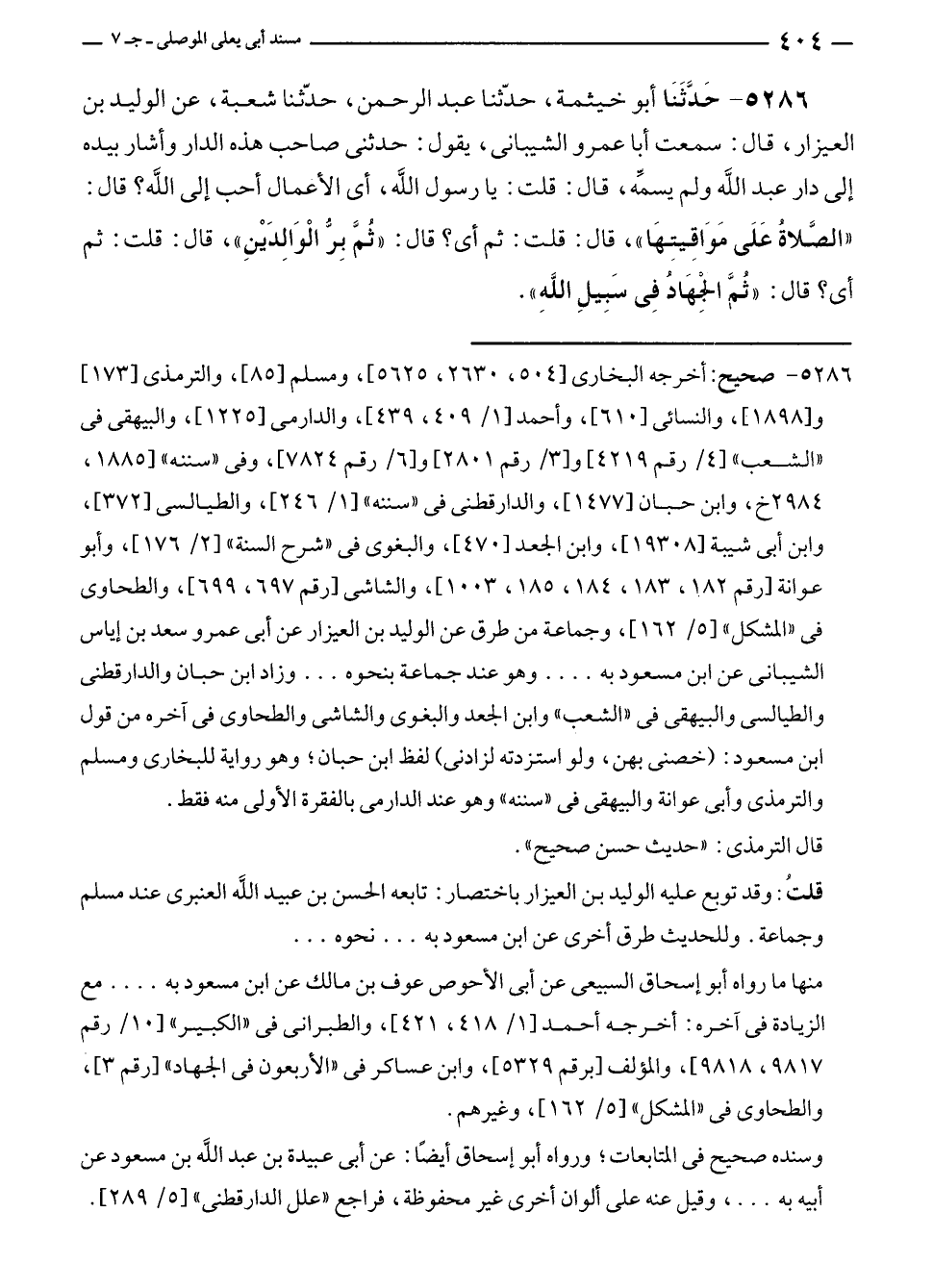 ٥٢٨٦ - صحيح: أخرجه البخارى [٥٠٤، ٢٦٣٠، ٥٦٢٥]، ومسلم [٨٥]، والترمذى [١٧٣] و [١٨٩٨]، والنسائى [٦١٠]، وأحمد [١/ ٤٠٩، ٤٣٩]، والدارمى [١٢٢٥]، والبيهقى في "الشعب" [٤/ رقم ٤٢١٩] و [٣/ رقم ٢٨٠١] و [٦/ رقم ٧٨٢٤]، وفى "سننه" [١٨٨٥، ٢٩٨٤ خ، وابن حبان [١٤٧٧]، والدارقطنى في "سننه" [١/ ٢٤٦]، والطيالسى [٣٧٢]، وابن أبى شيبة [١٩٣٠٨]، وابن الجعد [٤٠٧]، والبغوى في "شرح السنة" [٢/ ١٧٦]، وأبو عوانة [رقم ١٨٢، ١٨٣، ١٨٤، ١٨٥، ١٠٠٣]، والشاشى [رقم ٦٩٧، ٦٩٩]، والطحاوى في "المشكل" [٥/ ١٦٢]، وجماعة من طرق عن الوليد بن العيزار عن أبى عمرو سعد بن إياس الشيبانى عن ابن مسعود به .... وهو عند جماعة بنحوه ... وزاد ابن حبان والدارقطنى والطيالسى والبيهقى في "الشعب" وابن الجعد والبغوى والشاشى والطحاوى في آخره من قول ابن مسعود: (خصنى بهن، ولو استزدته لزادنى) لفظ ابن حبان؛ وهو رواية للبخارى ومسلم والترمذى وأبى عوانة والبيهقى في "سننه" وهو عند الدارمى بالفقرة الأولى منه فقط.