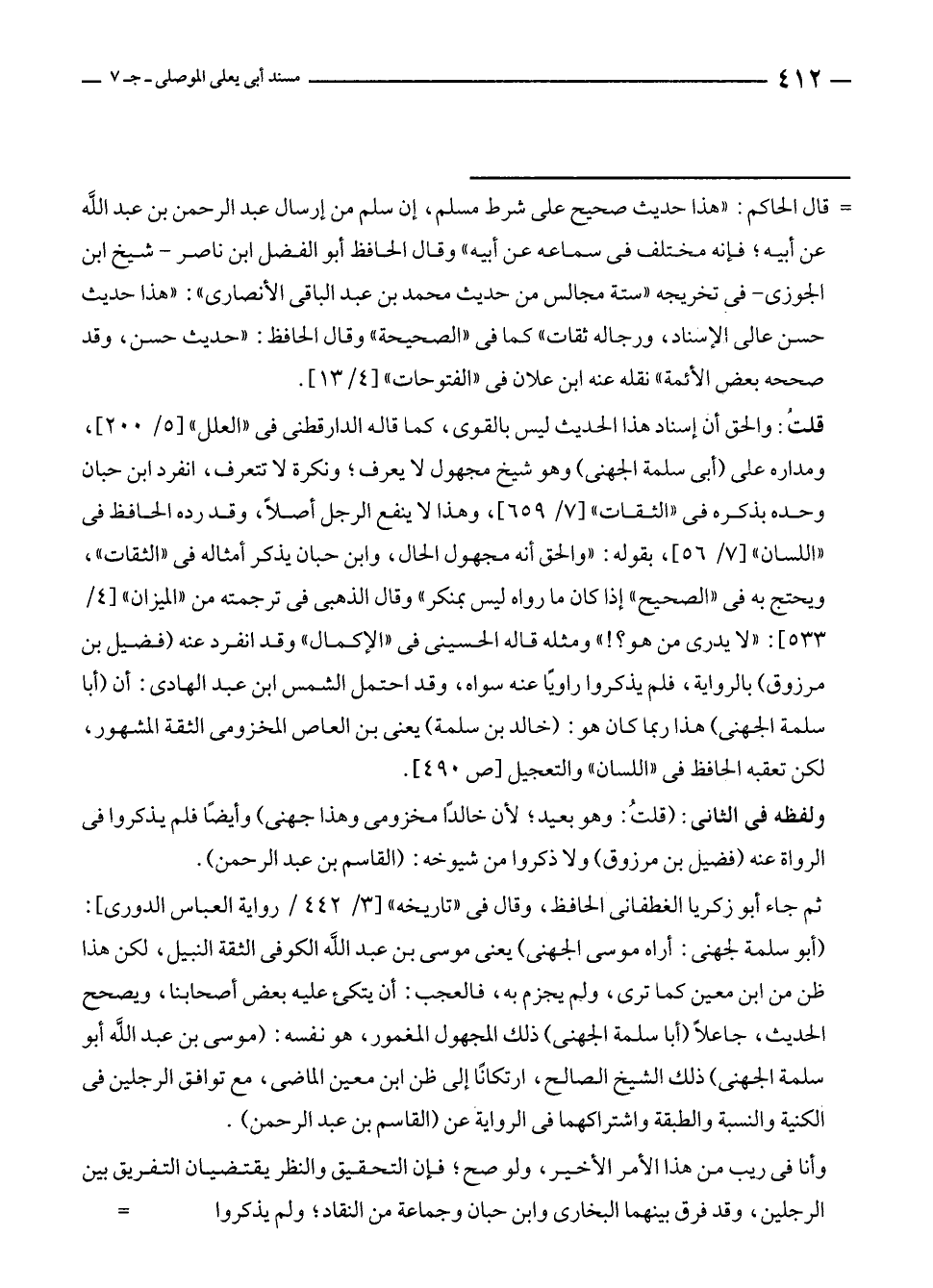 ثم جاء أبو زكريا الغطفانى الحافظ، وقال في "تاريخه" [٣/ ٤٤٢/ رواية العباس الدورى]: (أبو سلمة لجهنى: أراه موسى الجهنى) يعنى موسى بن عبد الله الكوفى الثقة النبيل، لكن هذا ظن من ابن معين كما ترى، ولم يجزم به، فالعجب: أن يتكئ عليه بعض أصحابنا، ويصحح الحديث، جاعلًا (أبا سلمة الجهنى) ذلك المجهول المغمور، هو نفسه: (موسى بن عبد الله أبو سلمة الجهنى) ذلك الشيخ الصالح، ارتكانًا إلى ظن ابن معين الماضى، مع توافق الرجلين في الكنية والنسبة والطبقة واشتراكهما في الرواية عن (القاسم بن عبد الرحمن).