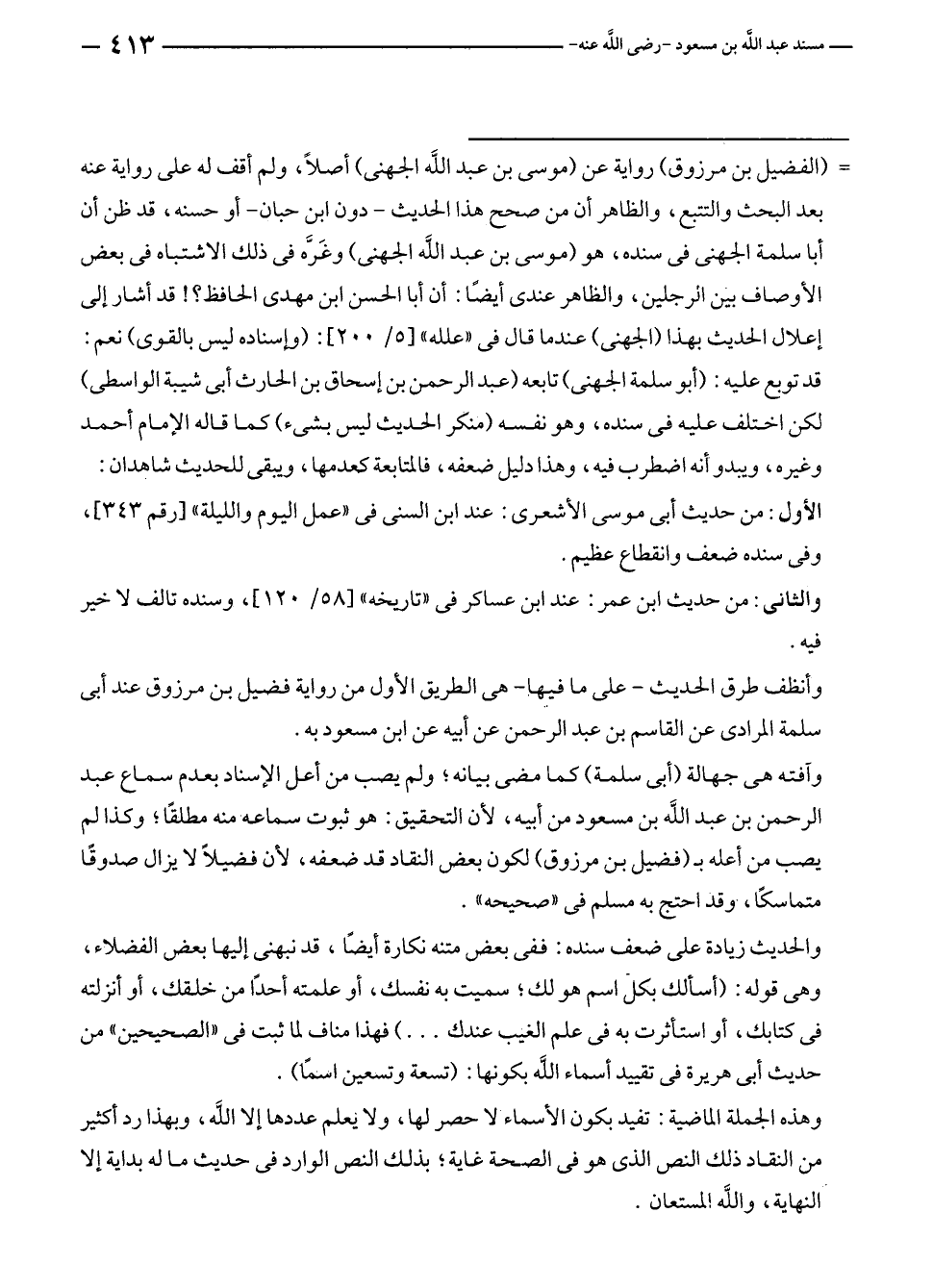 وآفته هي جهالة (أبى سلمة) كما مضى بيانه؛ ولم يصب من أعل الإسناد بعدم سماع عبد الرحمن بن عبد الله بن مسعود من أبيه، لأن التحقيق: هو ثبوت سماعه منه مطلقًا؛ وكذا لم يصب من أعله بـ (فضيل بن مرزوق) لكون بعض النقاد قد ضعفه، لأن فضيلًا لا يزال صدوقًا متماسكًا، وقد احتج به مسلم في "صحيحه".