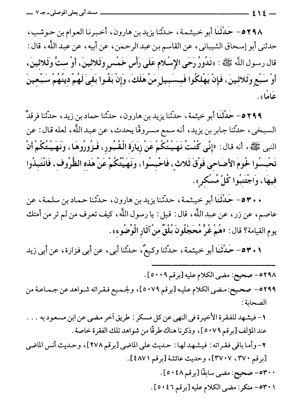 ٥٢٩٨ - حَدَّثَنَا أبو خيثمة، حدّثنا يزيد بن هارون، أخبرنا العوام بن حوشب، حدثنى أبو إسحاق الشيبانى، عن القاسم بن عبد الرحمن، عن أبيه، عن عبد الله، قال: قال رسول الله - صلى الله عليه وسلم -: "تَدُورُ رَحَى الإسْلامِ عَلَى رَأْسِ خَمْسٍ وَثَلاثِينَ، أَوْ سِتٍّ وَثَلاثِينَ، أَو سَبْعٍ وَثَلاثِينَ، فَإِن يَهْلِكُوا فَبِسَبِيلٍ مَنْ هَلَكَ، وَإِنَّ بَقُوا بَقِيَ لَهُمْ دِينُهُمْ سَبْعِينَ عَامًا".