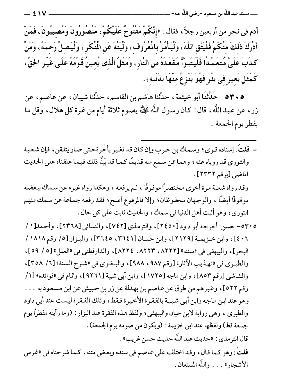 ٥٣٠٥ - حسن: أخرجه أبو داود [٢٤٥٠]، والترمذى [٧٤٢]، والنسائى [٢٣٦٨]، وأحمد [١/ ٤٠٦]، وابن خزيمة [٢١٢٩]، وابن حبان [٣٦٤١، ٣٦٤٥]، والبزار [٥/ رقم ١٨١٨/ البحر]، والبيهقى في "سننه" [٨٢٢٢، ٨٢٢٣، ٨٢٢٤]، والدارقطنى في "العلل" [٥/ ٥٩]، والطبرى في "تهذيب الآثار" [رقم ٩٨٧، ٩٨٨]، والبغوى في "شرح السنة" [٦/ ٣٥٨]، والشاشى [رقم ٨٥٣]، وابن ماجه [١٧٢٥]، وابن أبى شيبة [٩٢٦١]، وتمام في "فوائده" [١/ رقم ٥٢٢]، وغيرهم من طرق عن عاصم بن بهدلة عن زر بن حبيش عن ابن مسعود به ...