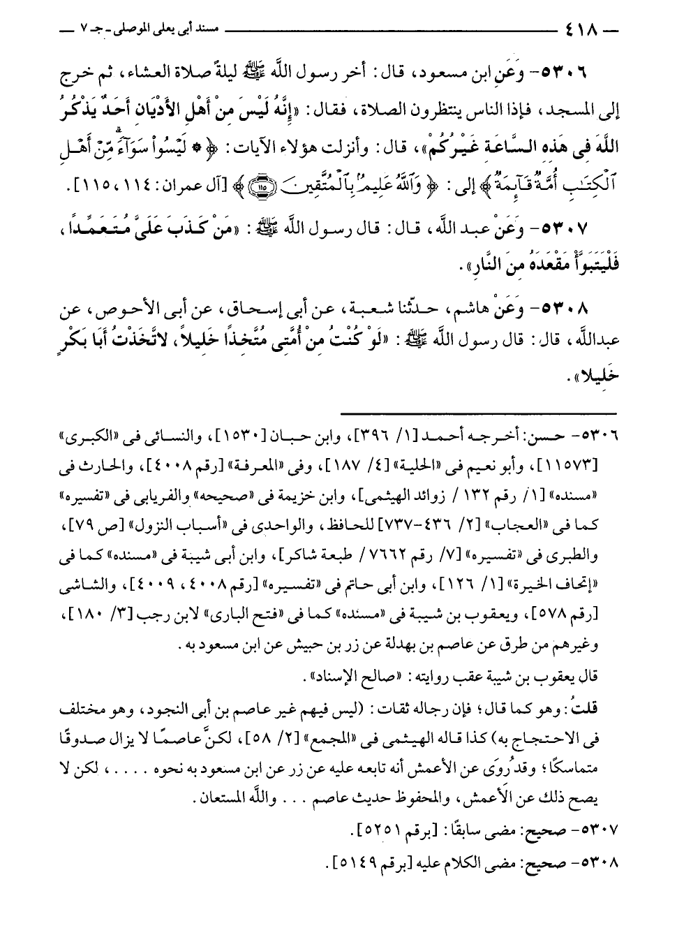 ٥٣٠٦ - حسن: أخرجه أحمد [١/ ٣٩٦]، وابن حبان [١٥٣٠]، والنسائى في "الكبرى" [١١٥٧٣]، وأبو نعيم في "الحلية" [٤/ ١٨٧]، وفى "المعرفة" [رقم ٤٠٠٨]، والحارث في "مسنده" [١/ رقم ١٣٢/ زوائد الهيثمى]، وابن خزيمة في "صحيحه" والفريابى في "تفسيره" كما في "العجاب" [٢/ ٤٣٦ - ٧٣٧]، للحافظ، والواحدى في "أسباب النزول" [ص ٧٩]، والطبرى في "تفسيره" [٧/ رقم ٧٦٦٢/ طبعة شاكر]، وابن أبى شيبة في "مسنده" كما في "إتحاف الخيرة" [١/ ١٢٦]، وابن أبى حاتم في "تفسيره" [رقم ٤٠٠٨، ٤٠٠٩]، والشاشى [رقم ٥٧٨]، ويعقوب بن شيبة في "مسنده" كما في "فتح البارى" لابن رجب [٣/ ١٨٠]، وغيرهم من طرق عن عاصم بن بهدلة عن زر بن حبيش عن ابن مسعود به.