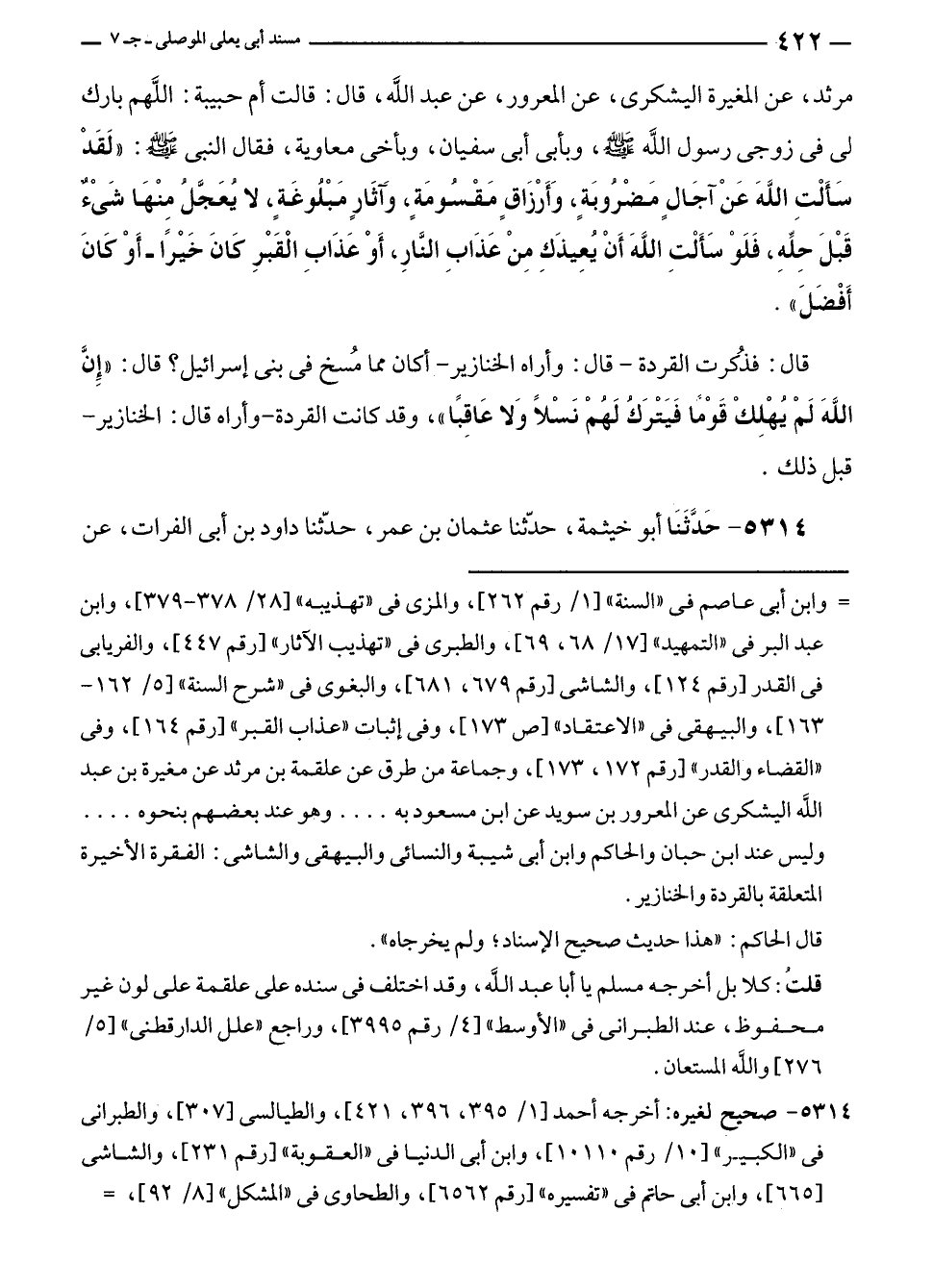 مرثد، عن المغيرة اليشكرى، عن المعرور، عن عبد الله، قال: قالت أم حبيبة: اللَّهم بارك لى في زوجى رسول الله - صلى الله عليه وسلم -، وبأبى أبى سفيان، وبأخى معاوية، فقال النبي - صلى الله عليه وسلم -: "لَقَدْ سَأَلْتِ اللَّهَ عَنْ آجَالٍ مَضْروبَةٍ، وَأَرْزَاقٍ مَقْسُومَةٍ، وَآثَارٍ مَبْلُوغَةٍ، لا يُعَجَّل مِنْهَا شَىْءٌ قَبْلَ حِلِّهِ، فَلَوْ سَأَلْتِ اللَّهَ أَنْ يُعِيذَكِ مِنْ عَذَابِ النَّارِ، أَوْ عَذَابِ الْقَبْرِ كَانَ خَيْرًا - أَوْ كَانَ أَفْضَلَ".