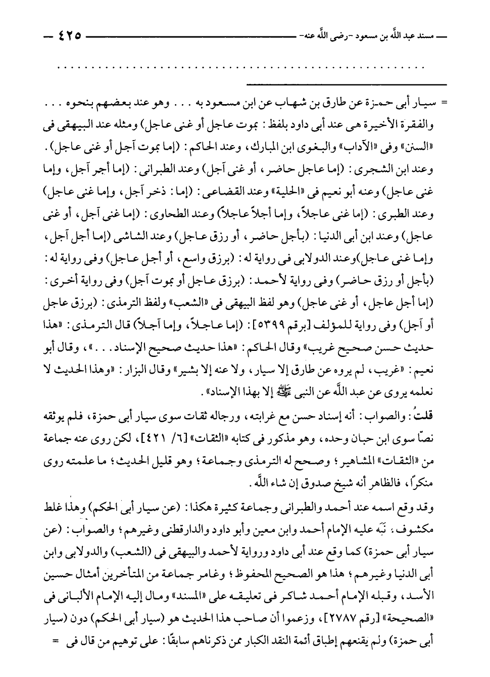 = سيار أبى حمزة عن طارق بن شهاب عن ابن مسعود به ... وهو عند بعضهم بنحوه ... والفقرة الأخيرة هي عند أبى داود بلفظ: بموت عاجل أو غنى عاجل) ومثله عند البيهقى في "السنن" وفى "الآداب" والبغوى ابن المبارك، وعند الحاكم: (إما بموت آجل أو غنى عاجل). وعند ابن الشجرى: (إما عاجل حاضر، أو غنى آجل) وعند الطبراني: (إما أجر آجل، وإما غنى عاجل) وعنه أبو نعيم في "الحلية" وعند القضاعى: (إما: ذخر آجل، وإما غنى عاجل) وعند الطبرى: (إما غنى عاجلًا، وإما أجلًا عاجلًا) وعند الطحاوى: (إما غنى آجل، أو غنى عاجل) وعند ابن أبى الدنيا: (بأجل حاضر، أو رزق عاجل) وعند الشاشى (إما أجل آجل، وإما غنى عاجل) وعند الدولابى في رواية له: (برزق واسع، أو أجل عاجل) وفى رواية له: (بأجل أو رزق حاضر) وفى رواية لأحمد: (برزق عاجل أو بموت آجل) وفى رواية أخرى: (إما أجل عاجل، أو غنى عاجل) وهو لفظ البيهقى في "الشعب" ولفظ الترمذى: (برزق عاجل أو آجل) وفى رواية للمؤلف [برقم ٥٣٩٩]: (إما عاجلًا، وإما آجلًا) قال الترمذى: "هذا حديث حسن صحيح غريب" وقال الحاكم: "هذا حديث صحيح الإسناد ... "، وقال أبو نعيم: "غريب، لم يروه عن طارق إلا سيار، ولا عنه إلا بشير" وقال البزار: "وهذا الحديث لا نعلمه يروى عن عبد الله عن النبي - صلى الله عليه وسلم - إلا بهذا الإسناد".