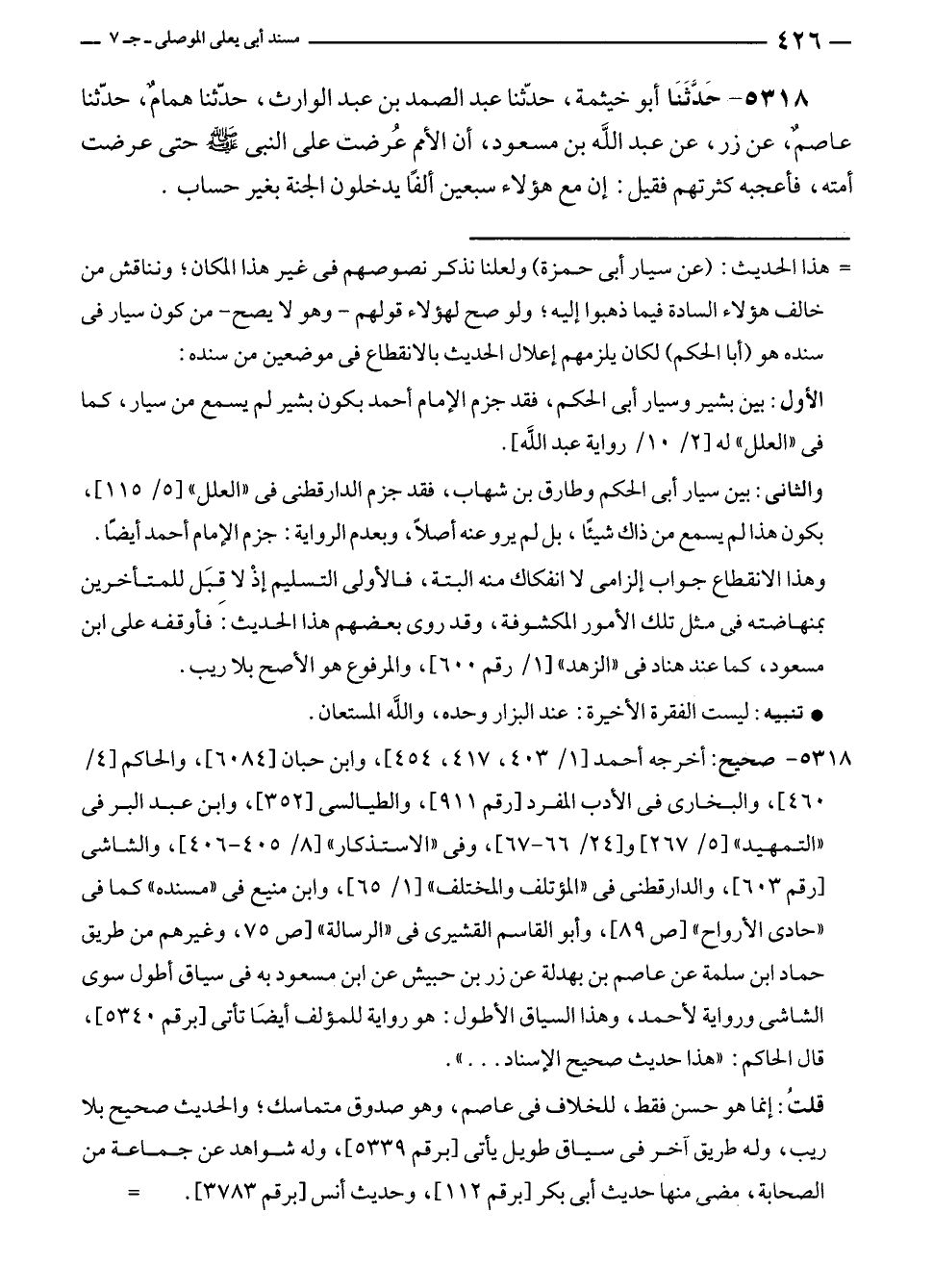 ٥٣١٨ - صحيح: أخرجه أحمد [١/ ٤٠٣، ٤١٧، ٤٥٤]، وابن حبان [٦٠٨٤]، والحاكم [٤/ ٤٦٠]، والبخارى في الأدب المفرد [رقم ٩١١]، والطيالسى [٣٥٢]، وابن عبد البر في "التمهيد" [٥/ ٢٦٧] و [٢٤/ ٦٦ - ٦٧]، وفى "الاستذكار" [٨/ ٤٠٥ - ٤٠٦]، والشاشى [رقم ٦٠٣]، والدارقطنى في "المؤلف والمختلف" [١/ ٦٥]، وابن منيع في "مسنده" كما في "حادى الأرواح" [ص ٨٩]، وأبو القاسم القشيرى في "الرسالة" [ص ٧٥]، وغيرهم من طريق حماد بن سلمة عن عاصم بن بهدلة عن زر بن حبيش عن ابن مسعود به في سياق أطول سوى الشاشى ورواية لأحمد، وهذا السياق الأطول: هو رواية للمؤلف أيضًا تأتى [برقم ٥٣٤٠]، قال الحاكم: "هذا حديث صحيح الإسناد ... ".