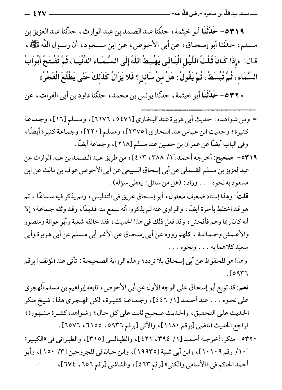 ٥٣١٩ - حَدَّثَنَا أبو خيثمة، حدّثنا عبد الصمد بن عبد الوارث، حدّثنا عبد العزيز بن مسلم، حدّثنا أبو إسحاق، عن أبى الأحوص، عن ابن مسعود، أن رسول الله - صلى الله عليه وسلم -، قال: "إِذَا كَانَ ثُلُثُ اللَّيْلِ الْبَاقِى يَهْبِطُ اللَّهُ إِلَى السَّمَاءِ الدُّنْيَا، ثُمَ تُفْتَحُ أَبْوَابُ السَّمَاءِ، ثُمَّ تُبْسَطُ، ثُمَّ يَقُولُ: هَلْ مِنْ سَائِلٍ؟ فَلا يَزَالُ كَذَلِكَ حَتَّى يَطْلُعَ الْفَجْرُ".