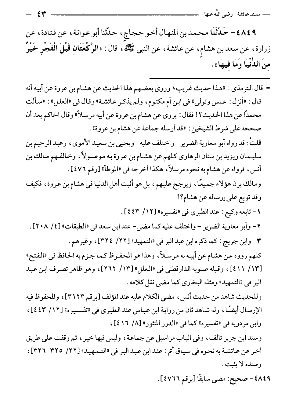 ٤٨٤٩ - حَدَّثَنَا محمد بن المنهال أخو حجاجٍ، حدّثنا أبو عوانة، عن قتادة، عن زرارة، عن سعد بن هشامٍ، عن عائشة، عن النبي - صلى الله عليه وسلم -، قال: "الرَّكْعَتَانِ قَبْلَ الْفَجْرِ خَيْرٌ مِنَ الدُّنْيَا وَمَا فِيهَا".