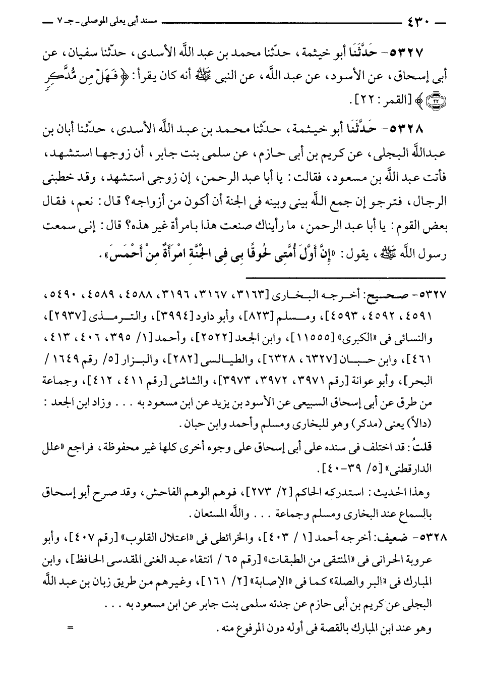 ٥٣٢٧ - صحيح: أخرجه البخارى [٣١٦٣، ٣١٦٧، ٣١٩٦، ٤٥٨٨، ٤٥٨٩، ٥٤٩٠، ٤٥٩١، ٤٥٩٢، ٤٥٩٣]، ومسلم [٨٢٣]، وأبو داود [٣٩٩٤]، والترمذى [٢٩٣٧]، والنسائى في "الكبرى" [١١٥٥٥]، وابن الجعد [٢٥٢٢]، وأحمد [١/ ٣٩٥، ٤٠٦، ٤١٣، ٤٦١]، وابن حبان [٦٣٢٧، ٦٣٢٨]، والطيالسى [٢٨٢]، والبزار [٥/ رقم ١٦٤٩/ البحر]، وأبو عوانة [رقم ٣٩٧١، ٣٩٧٢، ٣٩٧٣]، والشاشى [رقم ٤١١، ٤١٢]، وجماعة من طرق عن أبى إسحاق السبيعى عن الأسود بن يزيد عن ابن مسعود به ... وزاد ابن الجعد: (دالًا) يعنى (مدكر) وهو للبخارى ومسلم وأحمد وابن حبان.