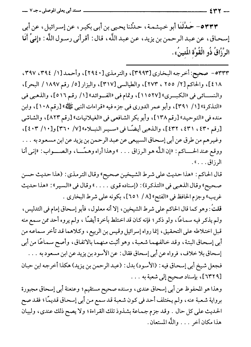 ٥٣٣٣ - حَدَّثَنَا أبو خيثمة، حدّثنا يحيى بن أبى بكير، عن إسرائيل، عن أبى إسحاق، عن عبد الرحمن بن يزيد، عن عبد الله، قال: أقرأنى رسول الله: "إِنِّي أَنَا الرَّزَّاقُ ذُو الْقُوَّةِ المتِينُ".
